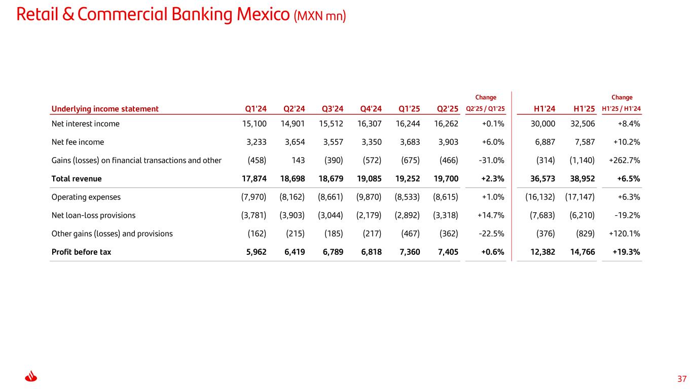 36 Retail & Commercial Banking Mexico (Constant EUR mn) Change Change Underlying income statement Q1'24 Q2'24 Q3'24 Q4'24 Q1'25 Q2'25 Q2'25 / Q1'25 H1'24 H1'25 H1'25 / H1'24 Net interest income 693 684 712 748 745 746 +0.1% 1,376 1,491 +8.4% Net fee income 148 168 163 154 169 179 +6.0% 316 348 +10.2% Gains (losses) on financial transactions and other (21) 7 (18) (26) (31) (21) -31.0% (14) (52) +262.7% Total revenue 820 858 857 876 883 904 +2.3% 1,678 1,787 +6.5% Operating expenses (366) (374) (397) (453) (391) (395) +1.0% (740) (787) +6.3% Net loan-loss provisions (173) (179) (140) (100) (133) (152) +14.7% (353) (285) -19.2% Other gains (losses) and provisions (7) (10) (8) (10) (21) (17) -22.5% (17) (38) +120.1% Profit before tax 274 295 311 313 338 340 +0.6% 568 677 +19.3%
