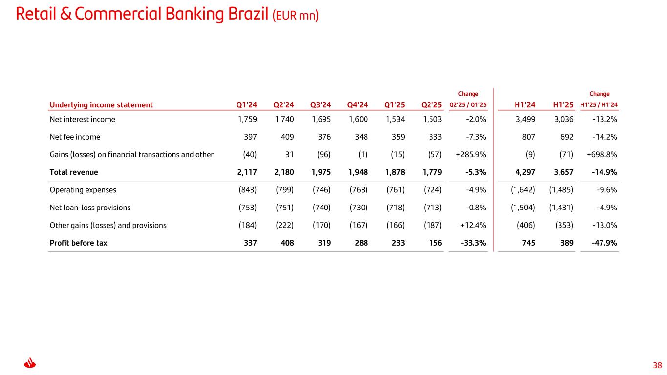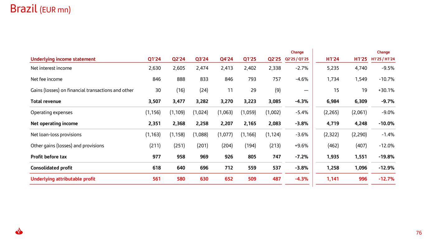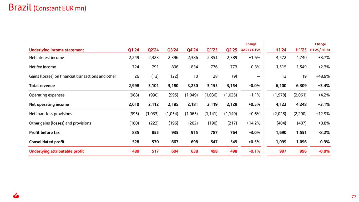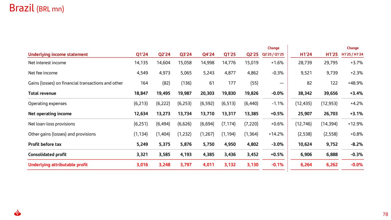 77 Brazil (Constant EUR mn) Change Change Underlying income statement Q1'24 Q2'24 Q3'24 Q4'24 Q1'25 Q2'25 Q2'25 / Q1'25 H1'24 H1'25 H1'25 / H1'24 Net interest income 2,249 2,323 2,396 2,386 2,351 2,389 +1.6% 4,572 4,740 +3.7% Net fee income 724 791 806 834 776 773 -0.3% 1,515 1,549 +2.3% Gains (losses) on financial transactions and other 26 (13) (22) 10 28 (9) — 13 19 +48.9% Total revenue 2,998 3,101 3,180 3,230 3,155 3,154 -0.0% 6,100 6,309 +3.4% Operating expenses (988) (990) (995) (1,049) (1,036) (1,025) -1.1% (1,978) (2,061) +4.2% Net operating income 2,010 2,112 2,185 2,181 2,119 2,129 +0.5% 4,122 4,248 +3.1% Net loan-loss provisions (995) (1,033) (1,054) (1,065) (1,141) (1,149) +0.6% (2,028) (2,290) +12.9% Other gains (losses) and provisions (180) (223) (196) (202) (190) (217) +14.2% (404) (407) +0.8% Profit before tax 835 855 935 915 787 764 -3.0% 1,690 1,551 -8.2% Consolidated profit 528 570 667 698 547 549 +0.5% 1,099 1,096 -0.3% Underlying attributable profit 480 517 604 638 498 498 -0.1% 997 996 -0.0%