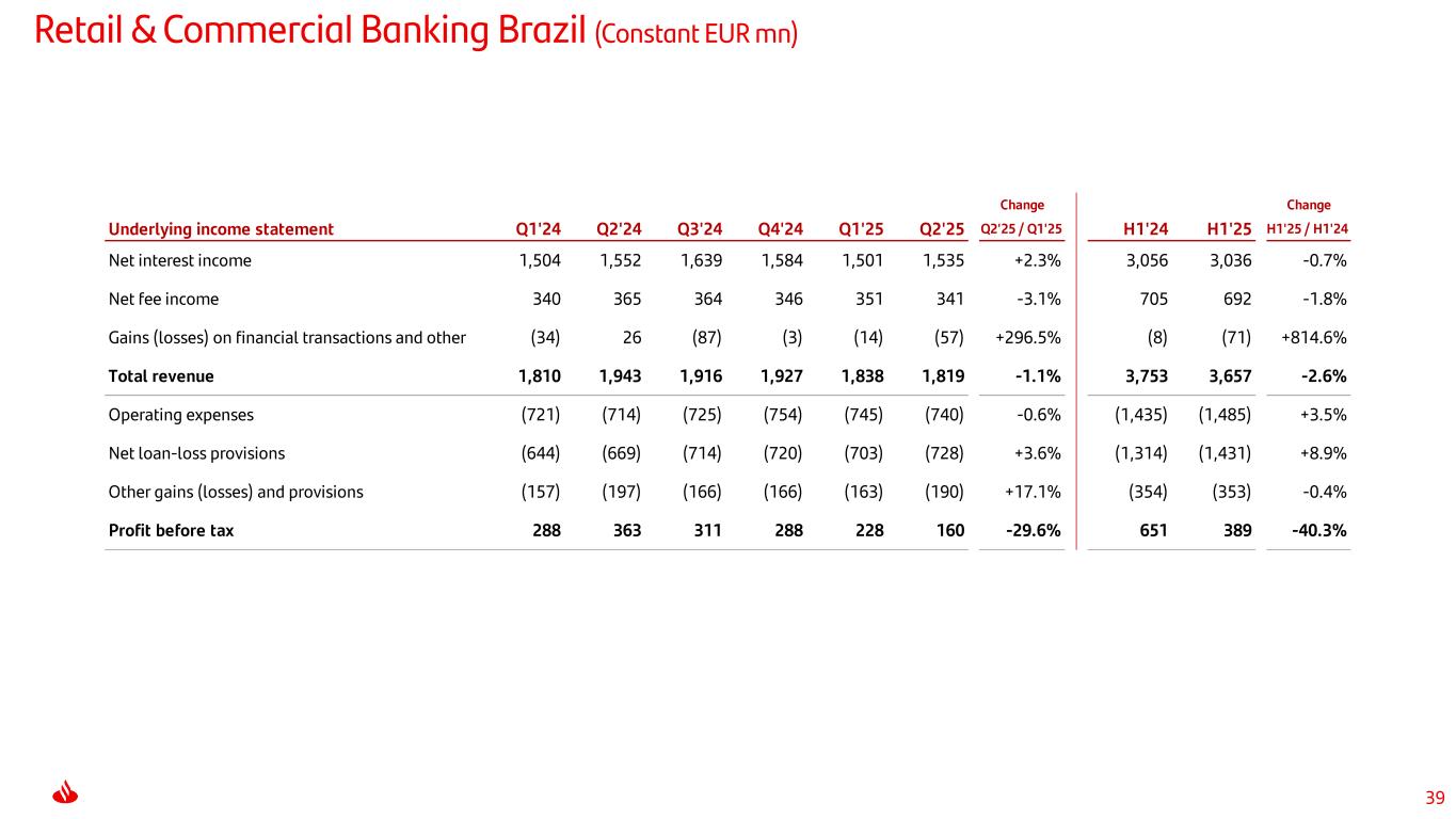 38 Retail & Commercial Banking Brazil (EUR mn) Change Change Underlying income statement Q1'24 Q2'24 Q3'24 Q4'24 Q1'25 Q2'25 Q2'25 / Q1'25 H1'24 H1'25 H1'25 / H1'24 Net interest income 1,759 1,740 1,695 1,600 1,534 1,503 -2.0% 3,499 3,036 -13.2% Net fee income 397 409 376 348 359 333 -7.3% 807 692 -14.2% Gains (losses) on financial transactions and other (40) 31 (96) (1) (15) (57) +285.9% (9) (71) +698.8% Total revenue 2,117 2,180 1,975 1,948 1,878 1,779 -5.3% 4,297 3,657 -14.9% Operating expenses (843) (799) (746) (763) (761) (724) -4.9% (1,642) (1,485) -9.6% Net loan-loss provisions (753) (751) (740) (730) (718) (713) -0.8% (1,504) (1,431) -4.9% Other gains (losses) and provisions (184) (222) (170) (167) (166) (187) +12.4% (406) (353) -13.0% Profit before tax 337 408 319 288 233 156 -33.3% 745 389 -47.9%