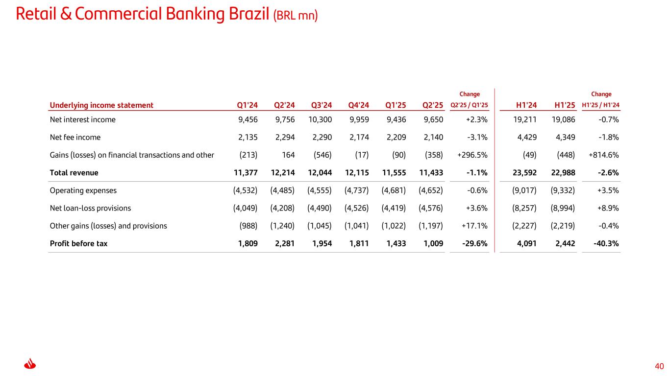 78 Brazil (BRL mn) Change Change Underlying income statement Q1'24 Q2'24 Q3'24 Q4'24 Q1'25 Q2'25 Q2'25 / Q1'25 H1'24 H1'25 H1'25 / H1'24 Net interest income 14,135 14,604 15,058 14,998 14,776 15,019 +1.6% 28,739 29,795 +3.7% Net fee income 4,549 4,973 5,065 5,243 4,877 4,862 -0.3% 9,521 9,739 +2.3% Gains (losses) on financial transactions and other 164 (82) (136) 61 177 (55) — 82 122 +48.9% Total revenue 18,847 19,495 19,987 20,303 19,830 19,826 -0.0% 38,342 39,656 +3.4% Operating expenses (6,213) (6,222) (6,253) (6,592) (6,513) (6,440) -1.1% (12,435) (12,953) +4.2% Net operating income 12,634 13,273 13,734 13,710 13,317 13,385 +0.5% 25,907 26,703 +3.1% Net loan-loss provisions (6,251) (6,494) (6,626) (6,694) (7,174) (7,220) +0.6% (12,746) (14,394) +12.9% Other gains (losses) and provisions (1,134) (1,404) (1,232) (1,267) (1,194) (1,364) +14.2% (2,538) (2,558) +0.8% Profit before tax 5,249 5,375 5,876 5,750 4,950 4,802 -3.0% 10,624 9,752 -8.2% Consolidated profit 3,321 3,585 4,193 4,385 3,436 3,452 +0.5% 6,906 6,888 -0.3% Underlying attributable profit 3,016 3,248 3,797 4,011 3,132 3,130 -0.1% 6,264 6,262 -0.0%