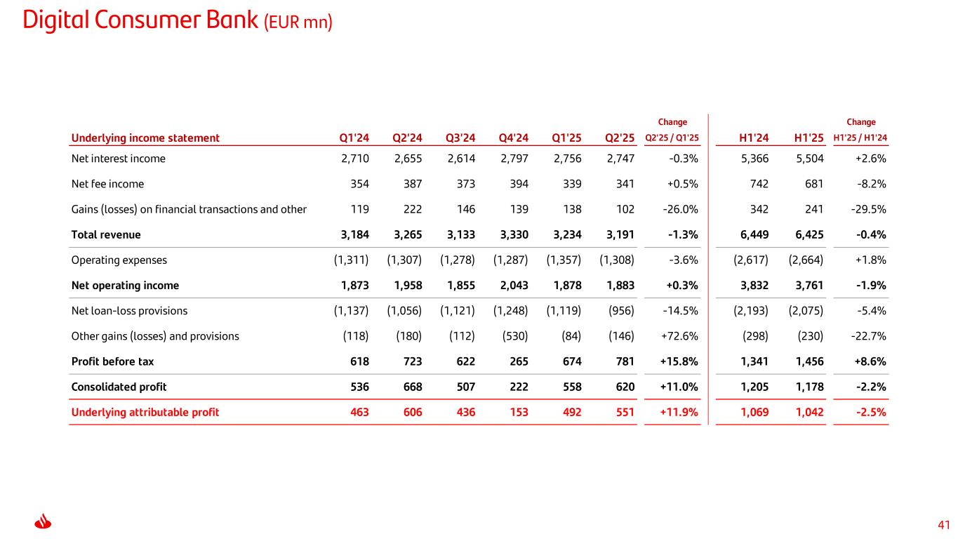 41 Digital Consumer Bank (EUR mn) Change Change Underlying income statement Q1'24 Q2'24 Q3'24 Q4'24 Q1'25 Q2'25 Q2'25 / Q1'25 H1'24 H1'25 H1'25 / H1'24 Net interest income 2,710 2,655 2,614 2,797 2,756 2,747 -0.3% 5,366 5,504 +2.6% Net fee income 354 387 373 394 339 341 +0.5% 742 681 -8.2% Gains (losses) on financial transactions and other 119 222 146 139 138 102 -26.0% 342 241 -29.5% Total revenue 3,184 3,265 3,133 3,330 3,234 3,191 -1.3% 6,449 6,425 -0.4% Operating expenses (1,311) (1,307) (1,278) (1,287) (1,357) (1,308) -3.6% (2,617) (2,664) +1.8% Net operating income 1,873 1,958 1,855 2,043 1,878 1,883 +0.3% 3,832 3,761 -1.9% Net loan-loss provisions (1,137) (1,056) (1,121) (1,248) (1,119) (956) -14.5% (2,193) (2,075) -5.4% Other gains (losses) and provisions (118) (180) (112) (530) (84) (146) +72.6% (298) (230) -22.7% Profit before tax 618 723 622 265 674 781 +15.8% 1,341 1,456 +8.6% Consolidated profit 536 668 507 222 558 620 +11.0% 1,205 1,178 -2.2% Underlying attributable profit 463 606 436 153 492 551 +11.9% 1,069 1,042 -2.5%