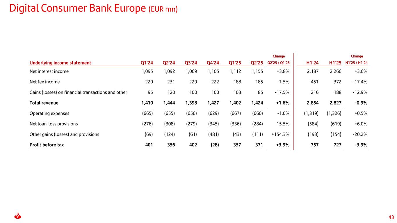 42 Digital Consumer Bank (Constant EUR mn) Change Change Underlying income statement Q1'24 Q2'24 Q3'24 Q4'24 Q1'25 Q2'25 Q2'25 / Q1'25 H1'24 H1'25 H1'25 / H1'24 Net interest income 2,656 2,604 2,611 2,766 2,703 2,801 +3.6% 5,260 5,504 +4.6% Net fee income 345 376 371 391 335 346 +3.3% 721 681 -5.7% Gains (losses) on financial transactions and other 119 222 147 135 136 105 -23.2% 341 241 -29.4% Total revenue 3,120 3,202 3,130 3,292 3,174 3,251 +2.4% 6,322 6,425 +1.6% Operating expenses (1,296) (1,289) (1,281) (1,274) (1,333) (1,332) -0.1% (2,585) (2,664) +3.1% Net operating income 1,824 1,913 1,849 2,019 1,841 1,920 +4.3% 3,737 3,761 +0.6% Net loan-loss provisions (1,102) (1,028) (1,120) (1,231) (1,094) (981) -10.4% (2,130) (2,075) -2.6% Other gains (losses) and provisions (115) (178) (111) (532) (83) (147) +77.3% (293) (230) -21.6% Profit before tax 607 707 618 256 664 792 +19.2% 1,314 1,456 +10.8% Consolidated profit 528 657 505 214 548 630 +15.0% 1,184 1,178 -0.6% Underlying attributable profit 455 595 435 146 481 561 +16.5% 1,050 1,042 -0.8%