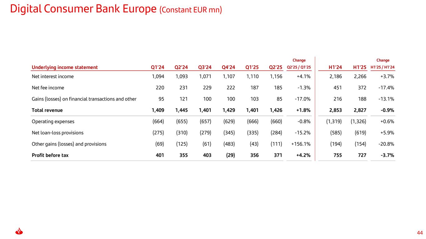 43 Digital Consumer Bank Europe (EUR mn) Change Change Underlying income statement Q1'24 Q2'24 Q3'24 Q4'24 Q1'25 Q2'25 Q2'25 / Q1'25 H1'24 H1'25 H1'25 / H1'24 Net interest income 1,095 1,092 1,069 1,105 1,112 1,155 +3.8% 2,187 2,266 +3.6% Net fee income 220 231 229 222 188 185 -1.5% 451 372 -17.4% Gains (losses) on financial transactions and other 95 120 100 100 103 85 -17.5% 216 188 -12.9% Total revenue 1,410 1,444 1,398 1,427 1,402 1,424 +1.6% 2,854 2,827 -0.9% Operating expenses (665) (655) (656) (629) (667) (660) -1.0% (1,319) (1,326) +0.5% Net loan-loss provisions (276) (308) (279) (345) (336) (284) -15.5% (584) (619) +6.0% Other gains (losses) and provisions (69) (124) (61) (481) (43) (111) +154.3% (193) (154) -20.2% Profit before tax 401 356 402 (28) 357 371 +3.9% 757 727 -3.9%