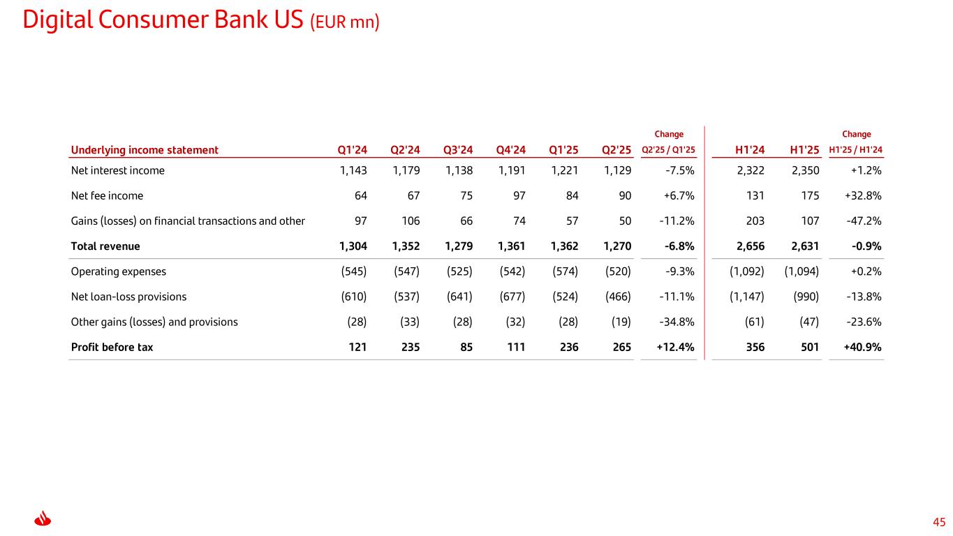 44 Digital Consumer Bank Europe (Constant EUR mn) Change Change Underlying income statement Q1'24 Q2'24 Q3'24 Q4'24 Q1'25 Q2'25 Q2'25 / Q1'25 H1'24 H1'25 H1'25 / H1'24 Net interest income 1,094 1,093 1,071 1,107 1,110 1,156 +4.1% 2,186 2,266 +3.7% Net fee income 220 231 229 222 187 185 -1.3% 451 372 -17.4% Gains (losses) on financial transactions and other 95 121 100 100 103 85 -17.0% 216 188 -13.1% Total revenue 1,409 1,445 1,401 1,429 1,401 1,426 +1.8% 2,853 2,827 -0.9% Operating expenses (664) (655) (657) (629) (666) (660) -0.8% (1,319) (1,326) +0.6% Net loan-loss provisions (275) (310) (279) (345) (335) (284) -15.2% (585) (619) +5.9% Other gains (losses) and provisions (69) (125) (61) (483) (43) (111) +156.1% (194) (154) -20.8% Profit before tax 401 355 403 (29) 356 371 +4.2% 755 727 -3.7%