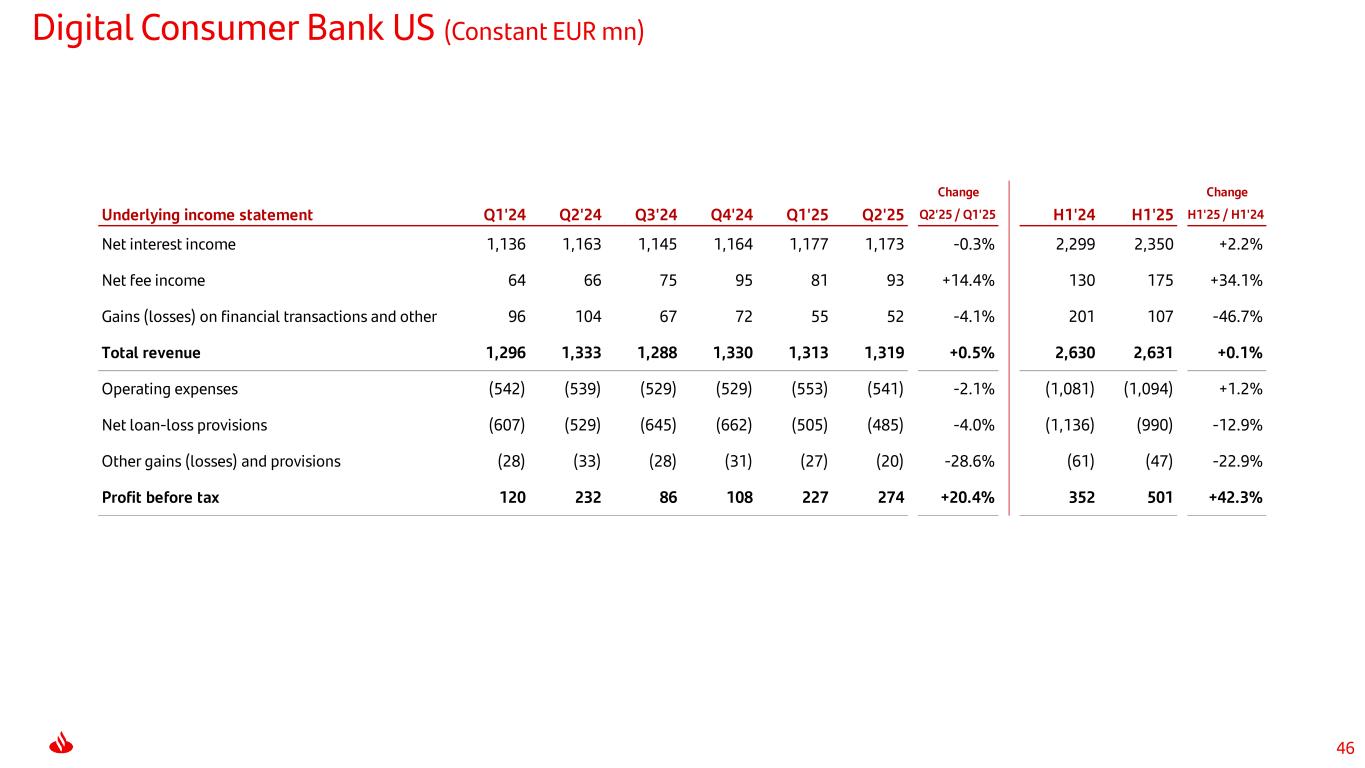 45 Digital Consumer Bank US (EUR mn) Change Change Underlying income statement Q1'24 Q2'24 Q3'24 Q4'24 Q1'25 Q2'25 Q2'25 / Q1'25 H1'24 H1'25 H1'25 / H1'24 Net interest income 1,143 1,179 1,138 1,191 1,221 1,129 -7.5% 2,322 2,350 +1.2% Net fee income 64 67 75 97 84 90 +6.7% 131 175 +32.8% Gains (losses) on financial transactions and other 97 106 66 74 57 50 -11.2% 203 107 -47.2% Total revenue 1,304 1,352 1,279 1,361 1,362 1,270 -6.8% 2,656 2,631 -0.9% Operating expenses (545) (547) (525) (542) (574) (520) -9.3% (1,092) (1,094) +0.2% Net loan-loss provisions (610) (537) (641) (677) (524) (466) -11.1% (1,147) (990) -13.8% Other gains (losses) and provisions (28) (33) (28) (32) (28) (19) -34.8% (61) (47) -23.6% Profit before tax 121 235 85 111 236 265 +12.4% 356 501 +40.9%