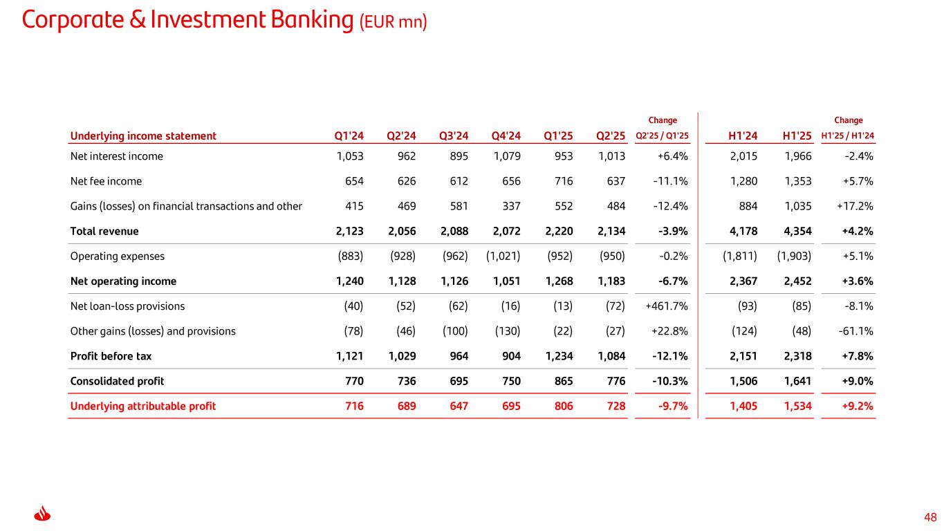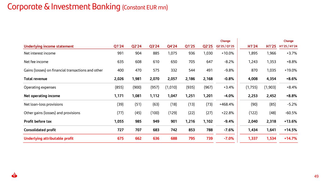 48 Corporate & Investment Banking (EUR mn) Change Change Underlying income statement Q1'24 Q2'24 Q3'24 Q4'24 Q1'25 Q2'25 Q2'25 / Q1'25 H1'24 H1'25 H1'25 / H1'24 Net interest income 1,053 962 895 1,079 953 1,013 +6.4% 2,015 1,966 -2.4% Net fee income 654 626 612 656 716 637 -11.1% 1,280 1,353 +5.7% Gains (losses) on financial transactions and other 415 469 581 337 552 484 -12.4% 884 1,035 +17.2% Total revenue 2,123 2,056 2,088 2,072 2,220 2,134 -3.9% 4,178 4,354 +4.2% Operating expenses (883) (928) (962) (1,021) (952) (950) -0.2% (1,811) (1,903) +5.1% Net operating income 1,240 1,128 1,126 1,051 1,268 1,183 -6.7% 2,367 2,452 +3.6% Net loan-loss provisions (40) (52) (62) (16) (13) (72) +461.7% (93) (85) -8.1% Other gains (losses) and provisions (78) (46) (100) (130) (22) (27) +22.8% (124) (48) -61.1% Profit before tax 1,121 1,029 964 904 1,234 1,084 -12.1% 2,151 2,318 +7.8% Consolidated profit 770 736 695 750 865 776 -10.3% 1,506 1,641 +9.0% Underlying attributable profit 716 689 647 695 806 728 -9.7% 1,405 1,534 +9.2%