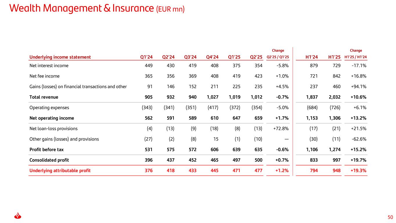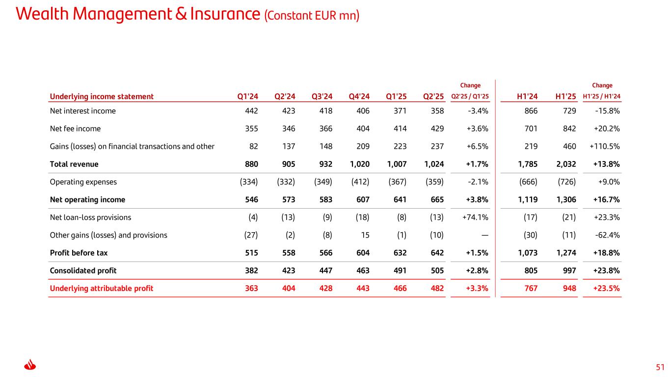 50 Wealth Management & Insurance (EUR mn) Change Change Underlying income statement Q1'24 Q2'24 Q3'24 Q4'24 Q1'25 Q2'25 Q2'25 / Q1'25 H1'24 H1'25 H1'25 / H1'24 Net interest income 449 430 419 408 375 354 -5.8% 879 729 -17.1% Net fee income 365 356 369 408 419 423 +1.0% 721 842 +16.8% Gains (losses) on financial transactions and other 91 146 152 211 225 235 +4.5% 237 460 +94.1% Total revenue 905 932 940 1,027 1,019 1,012 -0.7% 1,837 2,032 +10.6% Operating expenses (343) (341) (351) (417) (372) (354) -5.0% (684) (726) +6.1% Net operating income 562 591 589 610 647 659 +1.7% 1,153 1,306 +13.2% Net loan-loss provisions (4) (13) (9) (18) (8) (13) +72.8% (17) (21) +21.5% Other gains (losses) and provisions (27) (2) (8) 15 (1) (10) — (30) (11) -62.6% Profit before tax 531 575 572 606 639 635 -0.6% 1,106 1,274 +15.2% Consolidated profit 396 437 452 465 497 500 +0.7% 833 997 +19.7% Underlying attributable profit 376 418 433 445 471 477 +1.2% 794 948 +19.3%
