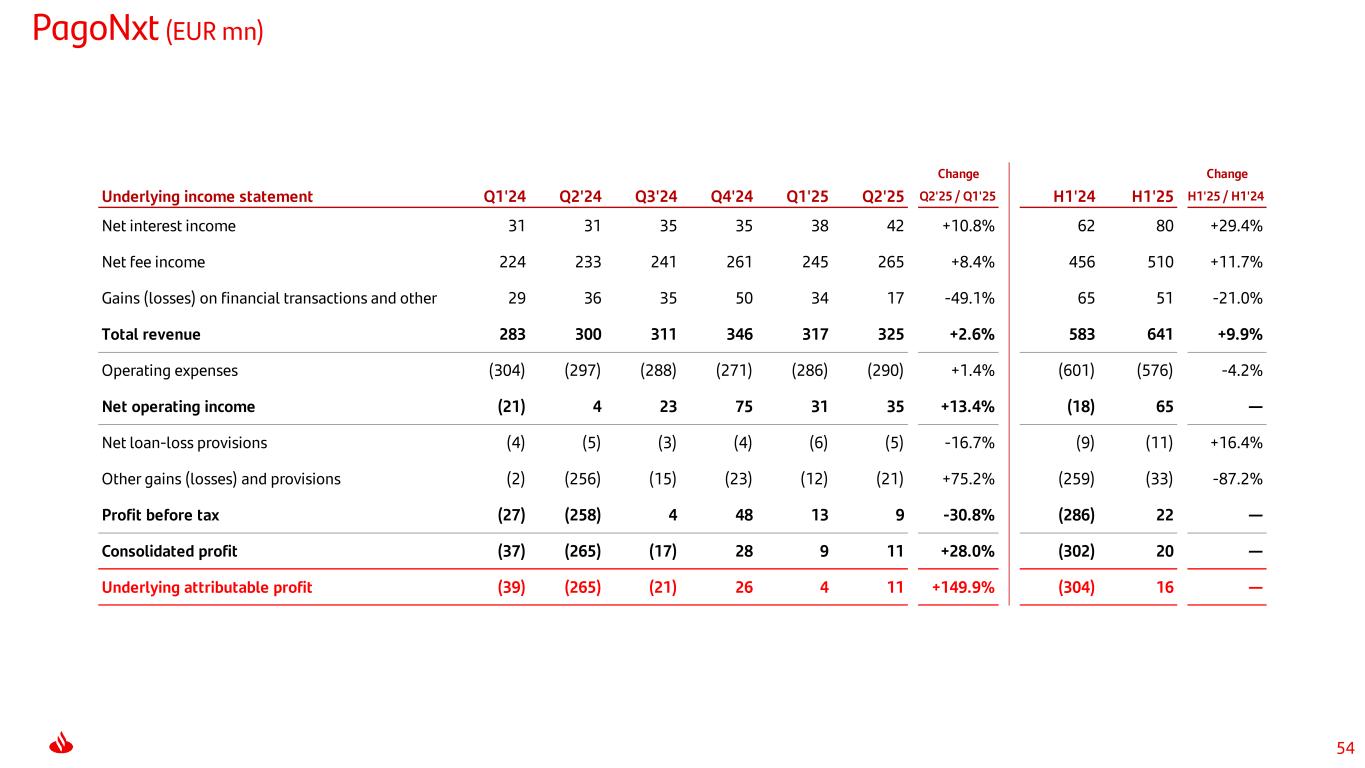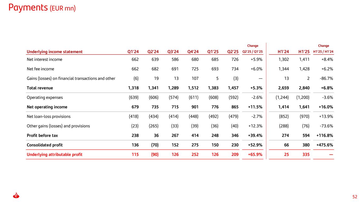 53 Payments (Constant EUR mn) Change Change Underlying income statement Q1'24 Q2'24 Q3'24 Q4'24 Q1'25 Q2'25 Q2'25 / Q1'25 H1'24 H1'25 H1'25 / H1'24 Net interest income 586 574 568 670 674 737 +9.4% 1,161 1,411 +21.6% Net fee income 606 635 675 715 684 744 +8.8% 1,241 1,428 +15.1% Gains (losses) on financial transactions and other (5) 22 14 100 5 (3) — 17 2 -89.8% Total revenue 1,187 1,231 1,257 1,486 1,363 1,477 +8.4% 2,418 2,840 +17.4% Operating expenses (602) (574) (567) (608) (602) (598) -0.8% (1,175) (1,200) +2.1% Net operating income 586 657 690 877 761 880 +15.6% 1,243 1,641 +32.0% Net loan-loss provisions (363) (389) (399) (439) (483) (487) +0.9% (752) (970) +29.0% Other gains (losses) and provisions (22) (265) (33) (38) (35) (41) +14.9% (287) (76) -73.4% Profit before tax 200 4 258 401 242 352 +45.1% 204 594 +191.0% Consolidated profit 113 (91) 147 266 147 233 +59.1% 22 380 — Underlying attributable profit 93 (109) 121 244 123 212 +72.5% (16) 335 —