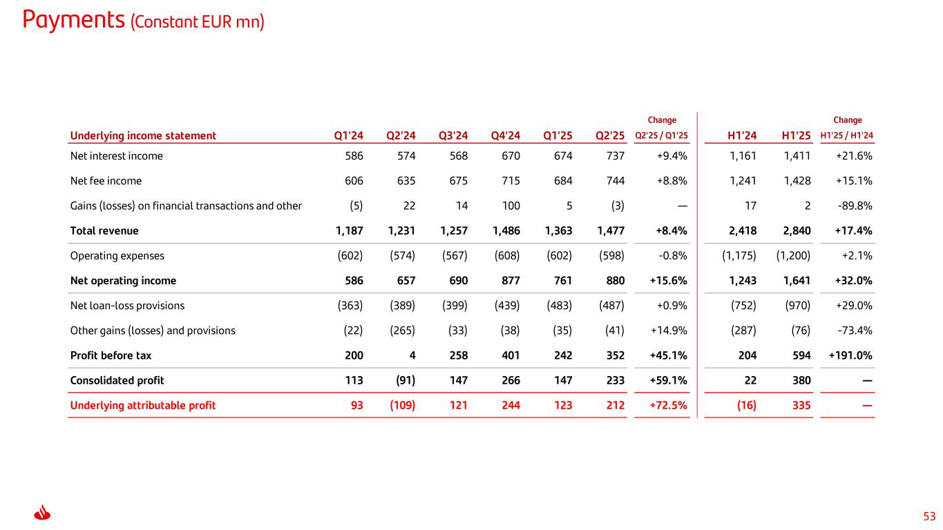 52 Payments (EUR mn) Change Change Underlying income statement Q1'24 Q2'24 Q3'24 Q4'24 Q1'25 Q2'25 Q2'25 / Q1'25 H1'24 H1'25 H1'25 / H1'24 Net interest income 662 639 586 680 685 726 +5.9% 1,302 1,411 +8.4% Net fee income 662 682 691 725 693 734 +6.0% 1,344 1,428 +6.2% Gains (losses) on financial transactions and other (6) 19 13 107 5 (3) — 13 2 -86.7% Total revenue 1,318 1,341 1,289 1,512 1,383 1,457 +5.3% 2,659 2,840 +6.8% Operating expenses (639) (606) (574) (611) (608) (592) -2.6% (1,244) (1,200) -3.6% Net operating income 679 735 715 901 776 865 +11.5% 1,414 1,641 +16.0% Net loan-loss provisions (418) (434) (414) (448) (492) (479) -2.7% (852) (970) +13.9% Other gains (losses) and provisions (23) (265) (33) (39) (36) (40) +12.3% (288) (76) -73.6% Profit before tax 238 36 267 414 248 346 +39.4% 274 594 +116.8% Consolidated profit 136 (70) 152 275 150 230 +52.9% 66 380 +475.6% Underlying attributable profit 115 (90) 126 252 126 209 +65.9% 25 335 —