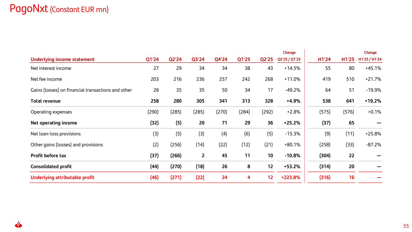 54 PagoNxt (EUR mn) Change Change Underlying income statement Q1'24 Q2'24 Q3'24 Q4'24 Q1'25 Q2'25 Q2'25 / Q1'25 H1'24 H1'25 H1'25 / H1'24 Net interest income 31 31 35 35 38 42 +10.8% 62 80 +29.4% Net fee income 224 233 241 261 245 265 +8.4% 456 510 +11.7% Gains (losses) on financial transactions and other 29 36 35 50 34 17 -49.1% 65 51 -21.0% Total revenue 283 300 311 346 317 325 +2.6% 583 641 +9.9% Operating expenses (304) (297) (288) (271) (286) (290) +1.4% (601) (576) -4.2% Net operating income (21) 4 23 75 31 35 +13.4% (18) 65 — Net loan-loss provisions (4) (5) (3) (4) (6) (5) -16.7% (9) (11) +16.4% Other gains (losses) and provisions (2) (256) (15) (23) (12) (21) +75.2% (259) (33) -87.2% Profit before tax (27) (258) 4 48 13 9 -30.8% (286) 22 — Consolidated profit (37) (265) (17) 28 9 11 +28.0% (302) 20 — Underlying attributable profit (39) (265) (21) 26 4 11 +149.9% (304) 16 —