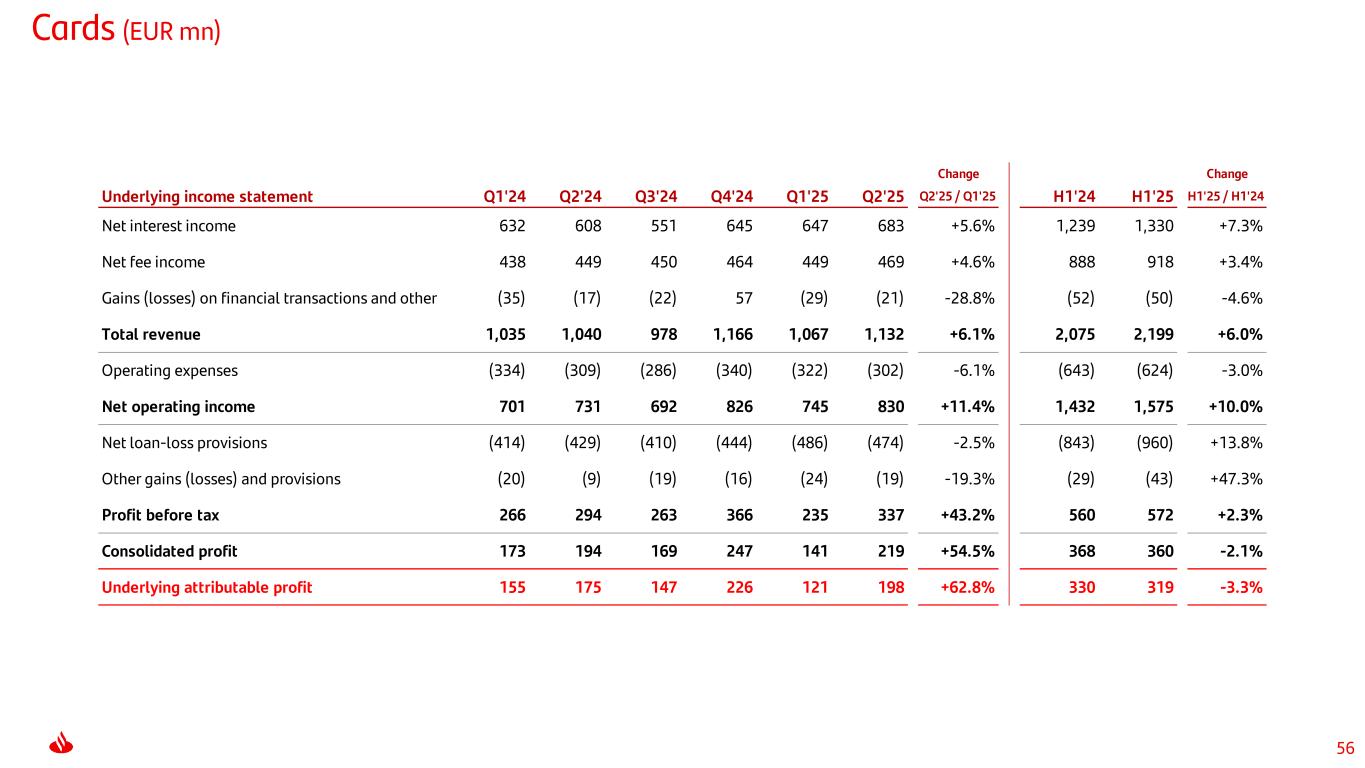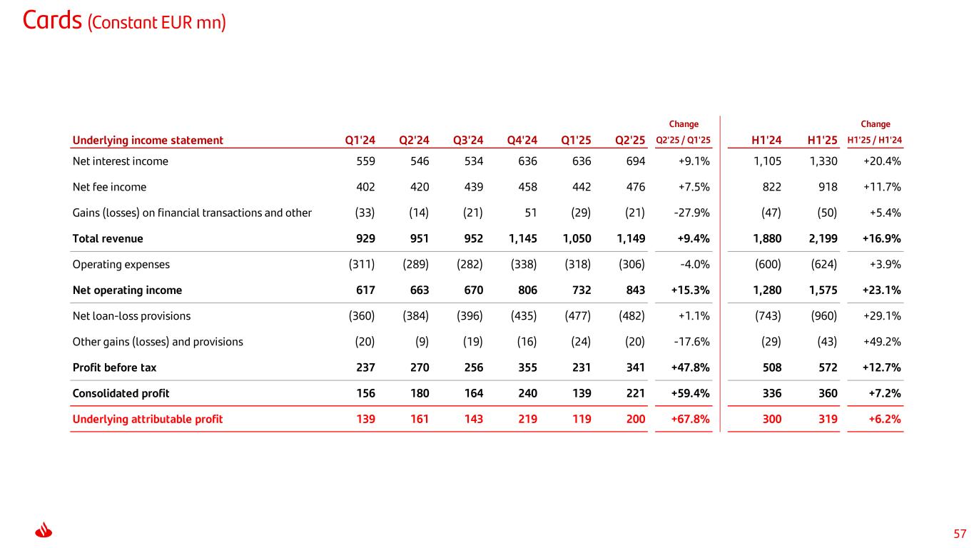56 Cards (EUR mn) Change Change Underlying income statement Q1'24 Q2'24 Q3'24 Q4'24 Q1'25 Q2'25 Q2'25 / Q1'25 H1'24 H1'25 H1'25 / H1'24 Net interest income 632 608 551 645 647 683 +5.6% 1,239 1,330 +7.3% Net fee income 438 449 450 464 449 469 +4.6% 888 918 +3.4% Gains (losses) on financial transactions and other (35) (17) (22) 57 (29) (21) -28.8% (52) (50) -4.6% Total revenue 1,035 1,040 978 1,166 1,067 1,132 +6.1% 2,075 2,199 +6.0% Operating expenses (334) (309) (286) (340) (322) (302) -6.1% (643) (624) -3.0% Net operating income 701 731 692 826 745 830 +11.4% 1,432 1,575 +10.0% Net loan-loss provisions (414) (429) (410) (444) (486) (474) -2.5% (843) (960) +13.8% Other gains (losses) and provisions (20) (9) (19) (16) (24) (19) -19.3% (29) (43) +47.3% Profit before tax 266 294 263 366 235 337 +43.2% 560 572 +2.3% Consolidated profit 173 194 169 247 141 219 +54.5% 368 360 -2.1% Underlying attributable profit 155 175 147 226 121 198 +62.8% 330 319 -3.3%