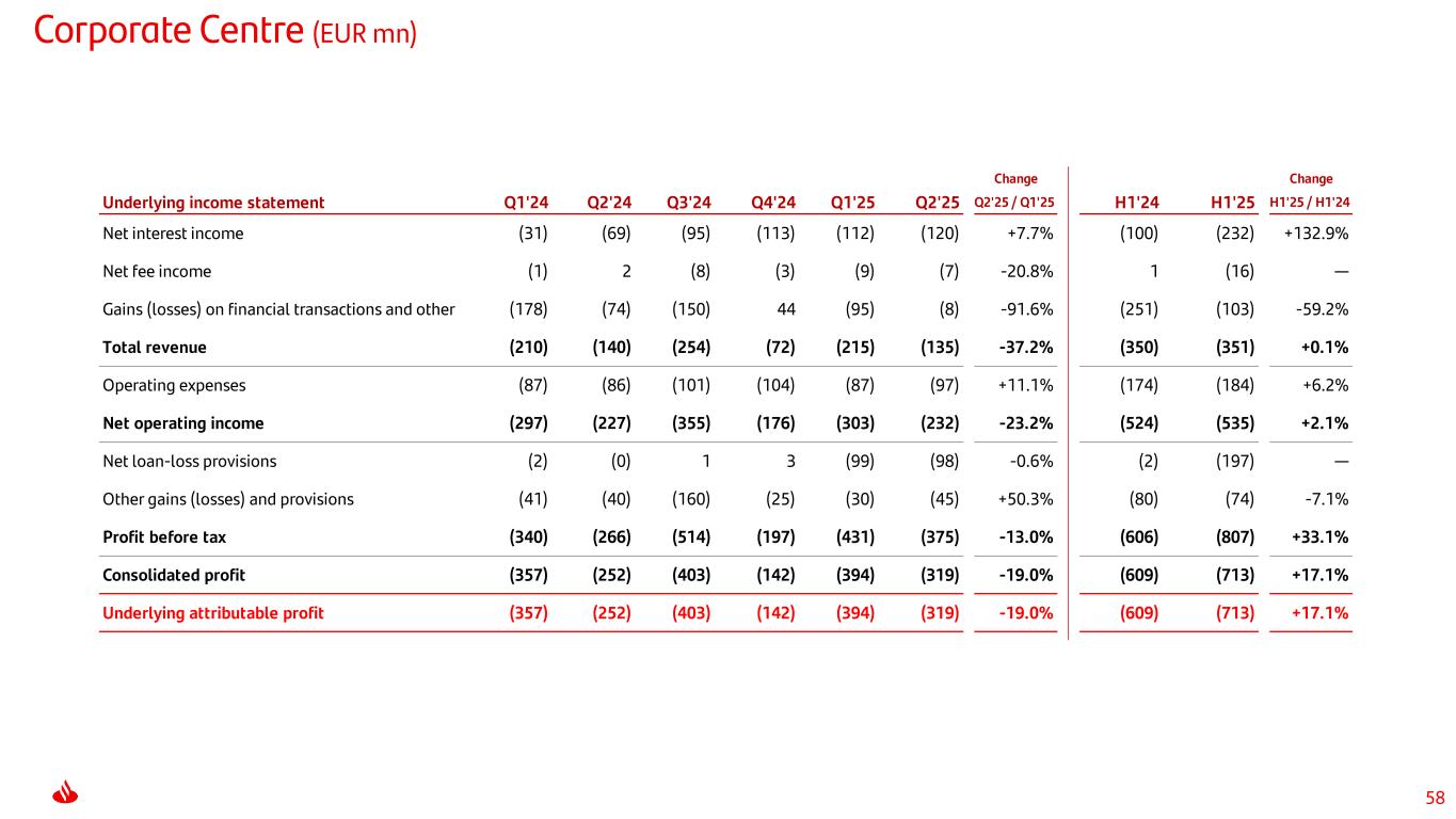 58 Corporate Centre (EUR mn) Change Change Underlying income statement Q1'24 Q2'24 Q3'24 Q4'24 Q1'25 Q2'25 Q2'25 / Q1'25 H1'24 H1'25 H1'25 / H1'24 Net interest income (31) (69) (95) (113) (112) (120) +7.7% (100) (232) +132.9% Net fee income (1) 2 (8) (3) (9) (7) -20.8% 1 (16) — Gains (losses) on financial transactions and other (178) (74) (150) 44 (95) (8) -91.6% (251) (103) -59.2% Total revenue (210) (140) (254) (72) (215) (135) -37.2% (350) (351) +0.1% Operating expenses (87) (86) (101) (104) (87) (97) +11.1% (174) (184) +6.2% Net operating income (297) (227) (355) (176) (303) (232) -23.2% (524) (535) +2.1% Net loan-loss provisions (2) (0) 1 3 (99) (98) -0.6% (2) (197) — Other gains (losses) and provisions (41) (40) (160) (25) (30) (45) +50.3% (80) (74) -7.1% Profit before tax (340) (266) (514) (197) (431) (375) -13.0% (606) (807) +33.1% Consolidated profit (357) (252) (403) (142) (394) (319) -19.0% (609) (713) +17.1% Underlying attributable profit (357) (252) (403) (142) (394) (319) -19.0% (609) (713) +17.1%