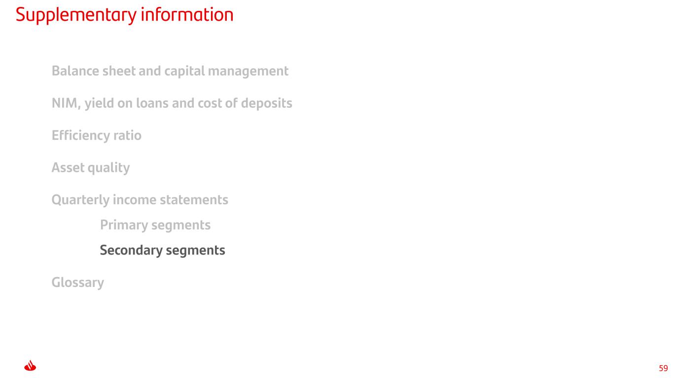 59 Supplementary information Balance sheet and capital management NIM, yield on loans and cost of deposits Efficiency ratio Asset quality Quarterly income statements Primary segments Secondary segments Glossary
