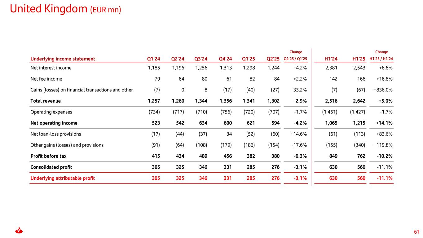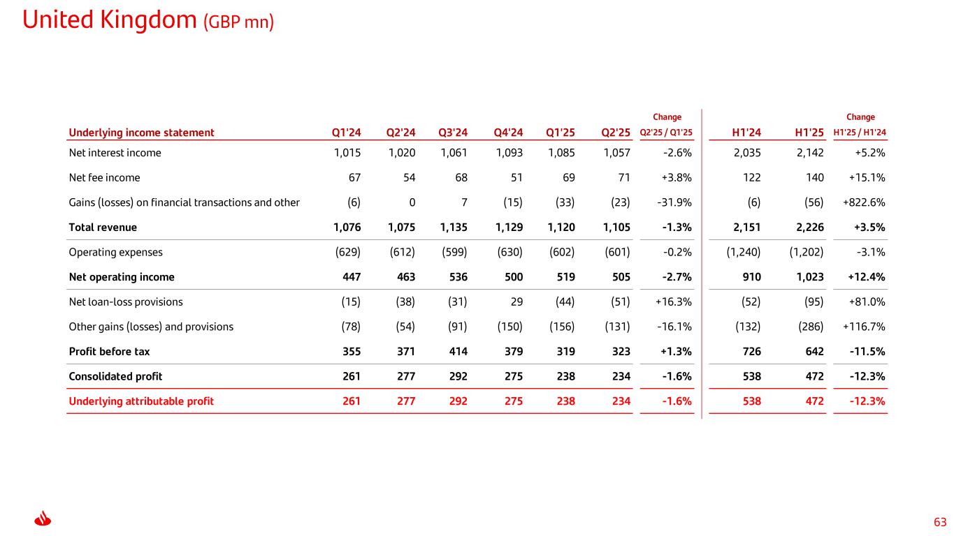 62 United Kingdom (Constant EUR mn) Change Change Underlying income statement Q1'24 Q2'24 Q3'24 Q4'24 Q1'25 Q2'25 Q2'25 / Q1'25 H1'24 H1'25 H1'25 / H1'24 Net interest income 1,205 1,211 1,260 1,298 1,288 1,255 -2.6% 2,416 2,543 +5.2% Net fee income 80 64 80 60 82 85 +3.8% 144 166 +15.1% Gains (losses) on financial transactions and other (7) 0 8 (17) (40) (27) -31.9% (7) (67) +822.6% Total revenue 1,277 1,276 1,348 1,341 1,330 1,312 -1.3% 2,553 2,642 +3.5% Operating expenses (746) (726) (712) (747) (714) (713) -0.2% (1,473) (1,427) -3.1% Net operating income 531 549 636 593 616 599 -2.7% 1,081 1,215 +12.4% Net loan-loss provisions (18) (45) (37) 35 (52) (61) +16.3% (62) (113) +81.0% Other gains (losses) and provisions (92) (65) (109) (178) (185) (155) -16.1% (157) (340) +116.7% Profit before tax 421 440 491 450 379 383 +1.3% 861 762 -11.5% Consolidated profit 310 329 347 327 282 278 -1.6% 639 560 -12.3% Underlying attributable profit 310 329 347 327 282 278 -1.6% 639 560 -12.3%