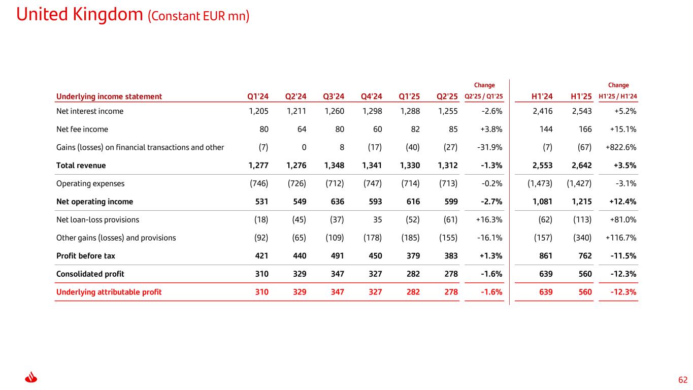 61 United Kingdom (EUR mn) Change Change Underlying income statement Q1'24 Q2'24 Q3'24 Q4'24 Q1'25 Q2'25 Q2'25 / Q1'25 H1'24 H1'25 H1'25 / H1'24 Net interest income 1,185 1,196 1,256 1,313 1,298 1,244 -4.2% 2,381 2,543 +6.8% Net fee income 79 64 80 61 82 84 +2.2% 142 166 +16.8% Gains (losses) on financial transactions and other (7) 0 8 (17) (40) (27) -33.2% (7) (67) +836.0% Total revenue 1,257 1,260 1,344 1,356 1,341 1,302 -2.9% 2,516 2,642 +5.0% Operating expenses (734) (717) (710) (756) (720) (707) -1.7% (1,451) (1,427) -1.7% Net operating income 523 542 634 600 621 594 -4.2% 1,065 1,215 +14.1% Net loan-loss provisions (17) (44) (37) 34 (52) (60) +14.6% (61) (113) +83.6% Other gains (losses) and provisions (91) (64) (108) (179) (186) (154) -17.6% (155) (340) +119.8% Profit before tax 415 434 489 456 382 380 -0.3% 849 762 -10.2% Consolidated profit 305 325 346 331 285 276 -3.1% 630 560 -11.1% Underlying attributable profit 305 325 346 331 285 276 -3.1% 630 560 -11.1%