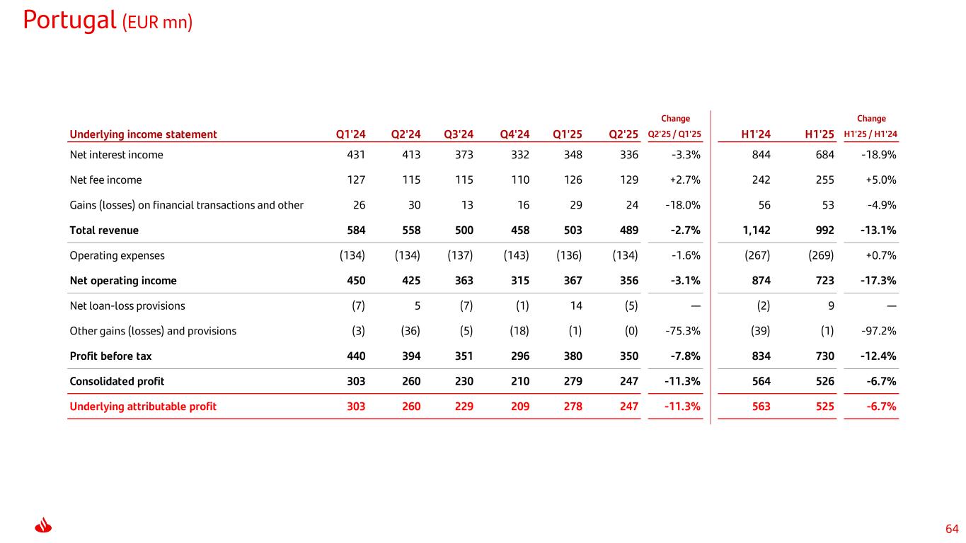 64 Portugal (EUR mn) Change Change Underlying income statement Q1'24 Q2'24 Q3'24 Q4'24 Q1'25 Q2'25 Q2'25 / Q1'25 H1'24 H1'25 H1'25 / H1'24 Net interest income 431 413 373 332 348 336 -3.3% 844 684 -18.9% Net fee income 127 115 115 110 126 129 +2.7% 242 255 +5.0% Gains (losses) on financial transactions and other 26 30 13 16 29 24 -18.0% 56 53 -4.9% Total revenue 584 558 500 458 503 489 -2.7% 1,142 992 -13.1% Operating expenses (134) (134) (137) (143) (136) (134) -1.6% (267) (269) +0.7% Net operating income 450 425 363 315 367 356 -3.1% 874 723 -17.3% Net loan-loss provisions (7) 5 (7) (1) 14 (5) — (2) 9 — Other gains (losses) and provisions (3) (36) (5) (18) (1) (0) -75.3% (39) (1) -97.2% Profit before tax 440 394 351 296 380 350 -7.8% 834 730 -12.4% Consolidated profit 303 260 230 210 279 247 -11.3% 564 526 -6.7% Underlying attributable profit 303 260 229 209 278 247 -11.3% 563 525 -6.7%