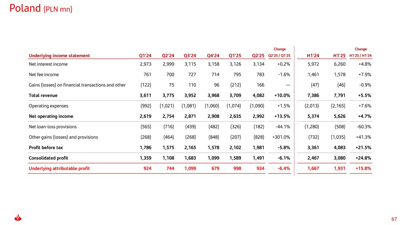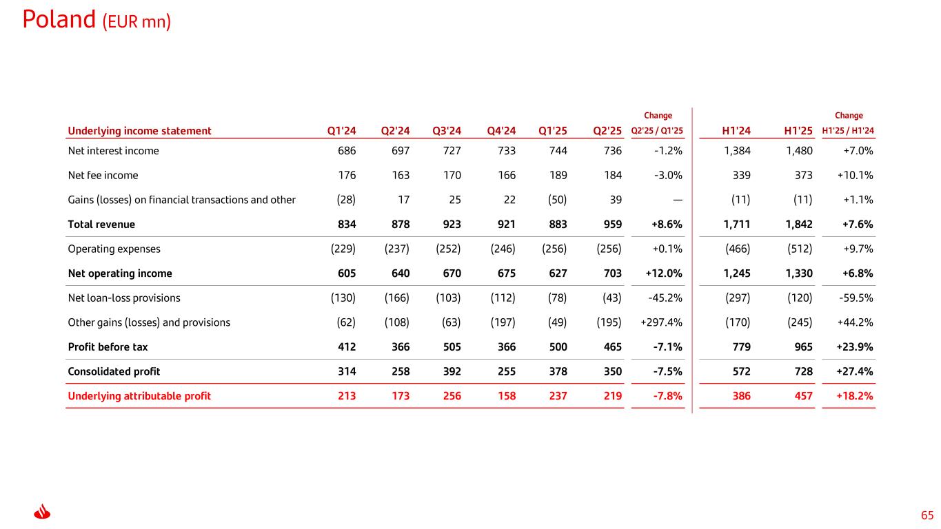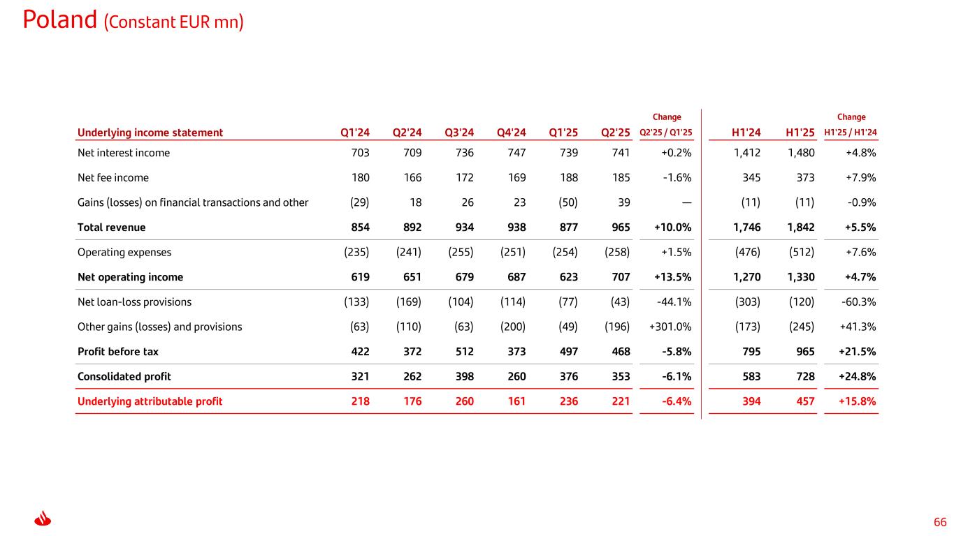 65 Poland (EUR mn) Change Change Underlying income statement Q1'24 Q2'24 Q3'24 Q4'24 Q1'25 Q2'25 Q2'25 / Q1'25 H1'24 H1'25 H1'25 / H1'24 Net interest income 686 697 727 733 744 736 -1.2% 1,384 1,480 +7.0% Net fee income 176 163 170 166 189 184 -3.0% 339 373 +10.1% Gains (losses) on financial transactions and other (28) 17 25 22 (50) 39 — (11) (11) +1.1% Total revenue 834 878 923 921 883 959 +8.6% 1,711 1,842 +7.6% Operating expenses (229) (237) (252) (246) (256) (256) +0.1% (466) (512) +9.7% Net operating income 605 640 670 675 627 703 +12.0% 1,245 1,330 +6.8% Net loan-loss provisions (130) (166) (103) (112) (78) (43) -45.2% (297) (120) -59.5% Other gains (losses) and provisions (62) (108) (63) (197) (49) (195) +297.4% (170) (245) +44.2% Profit before tax 412 366 505 366 500 465 -7.1% 779 965 +23.9% Consolidated profit 314 258 392 255 378 350 -7.5% 572 728 +27.4% Underlying attributable profit 213 173 256 158 237 219 -7.8% 386 457 +18.2%