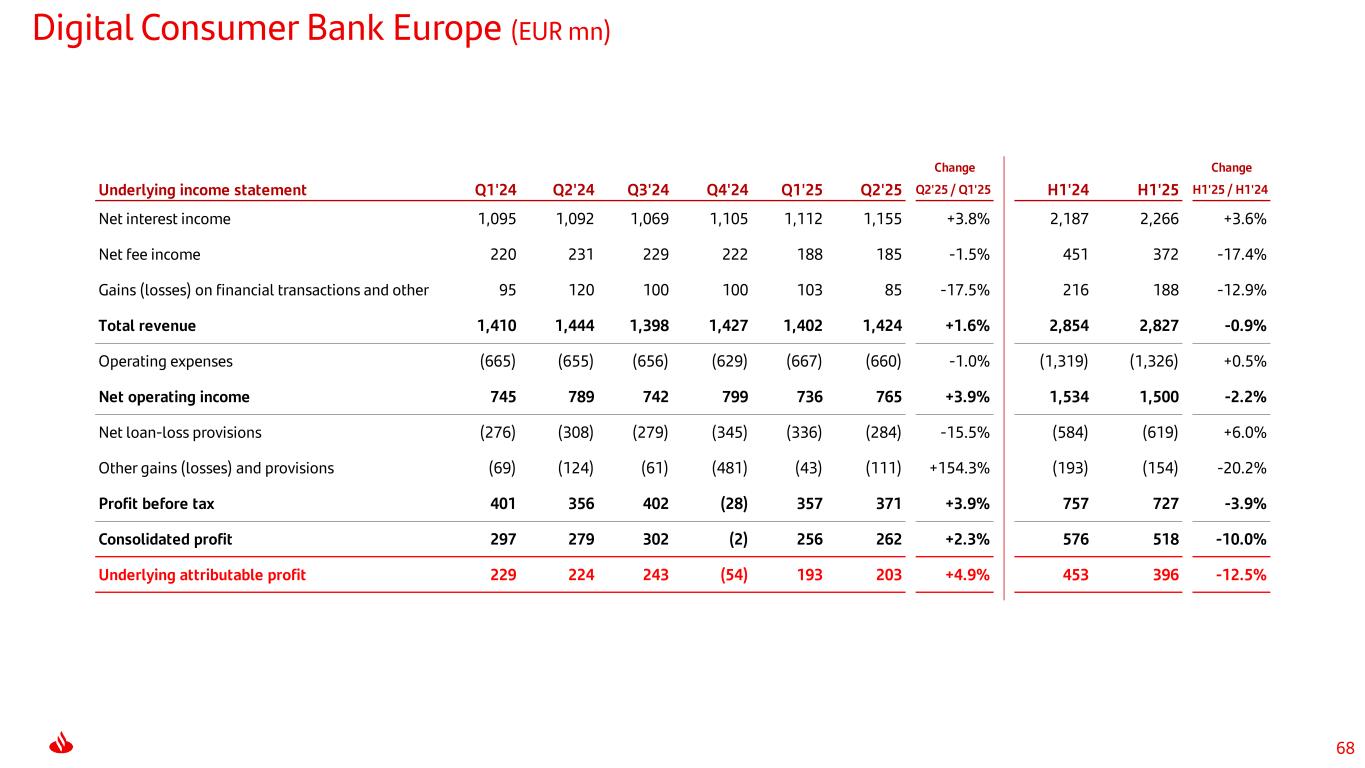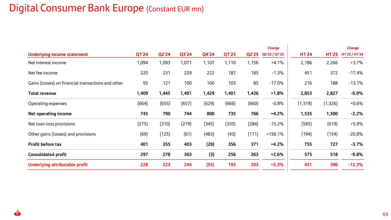 68 Digital Consumer Bank Europe (EUR mn) Change Change Underlying income statement Q1'24 Q2'24 Q3'24 Q4'24 Q1'25 Q2'25 Q2'25 / Q1'25 H1'24 H1'25 H1'25 / H1'24 Net interest income 1,095 1,092 1,069 1,105 1,112 1,155 +3.8% 2,187 2,266 +3.6% Net fee income 220 231 229 222 188 185 -1.5% 451 372 -17.4% Gains (losses) on financial transactions and other 95 120 100 100 103 85 -17.5% 216 188 -12.9% Total revenue 1,410 1,444 1,398 1,427 1,402 1,424 +1.6% 2,854 2,827 -0.9% Operating expenses (665) (655) (656) (629) (667) (660) -1.0% (1,319) (1,326) +0.5% Net operating income 745 789 742 799 736 765 +3.9% 1,534 1,500 -2.2% Net loan-loss provisions (276) (308) (279) (345) (336) (284) -15.5% (584) (619) +6.0% Other gains (losses) and provisions (69) (124) (61) (481) (43) (111) +154.3% (193) (154) -20.2% Profit before tax 401 356 402 (28) 357 371 +3.9% 757 727 -3.9% Consolidated profit 297 279 302 (2) 256 262 +2.3% 576 518 -10.0% Underlying attributable profit 229 224 243 (54) 193 203 +4.9% 453 396 -12.5%