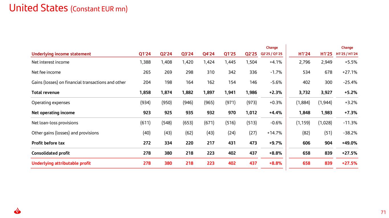70 United States (EUR mn) Change Change Underlying income statement Q1'24 Q2'24 Q3'24 Q4'24 Q1'25 Q2'25 Q2'25 / Q1'25 H1'24 H1'25 H1'25 / H1'24 Net interest income 1,396 1,428 1,411 1,458 1,499 1,450 -3.3% 2,824 2,949 +4.4% Net fee income 267 272 296 317 355 323 -8.8% 539 678 +25.8% Gains (losses) on financial transactions and other 205 201 163 167 160 140 -12.6% 406 300 -26.2% Total revenue 1,869 1,900 1,870 1,941 2,014 1,913 -5.0% 3,769 3,927 +4.2% Operating expenses (940) (963) (940) (987) (1,007) (937) -7.0% (1,903) (1,944) +2.2% Net operating income 929 938 929 954 1,006 976 -3.0% 1,866 1,983 +6.2% Net loan-loss provisions (615) (556) (650) (686) (535) (493) -7.8% (1,171) (1,028) -12.2% Other gains (losses) and provisions (40) (43) (62) (45) (25) (26) +6.9% (83) (51) -38.9% Profit before tax 274 339 217 223 447 457 +2.1% 612 904 +47.5% Consolidated profit 279 385 216 229 417 422 +1.3% 664 839 +26.2% Underlying attributable profit 279 385 216 229 417 422 +1.3% 664 839 +26.2%