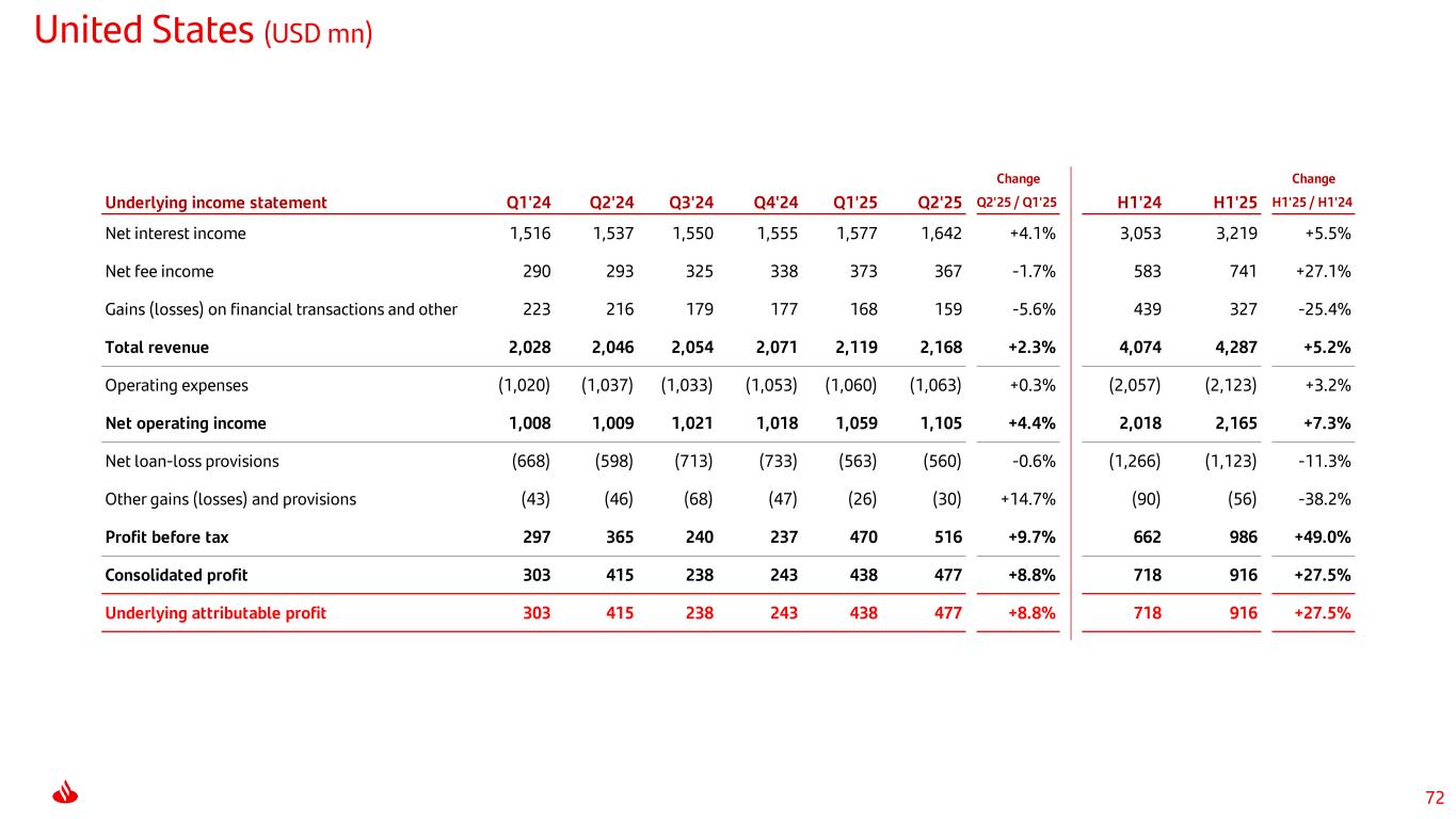 71 United States (Constant EUR mn) Change Change Underlying income statement Q1'24 Q2'24 Q3'24 Q4'24 Q1'25 Q2'25 Q2'25 / Q1'25 H1'24 H1'25 H1'25 / H1'24 Net interest income 1,388 1,408 1,420 1,424 1,445 1,504 +4.1% 2,796 2,949 +5.5% Net fee income 265 269 298 310 342 336 -1.7% 534 678 +27.1% Gains (losses) on financial transactions and other 204 198 164 162 154 146 -5.6% 402 300 -25.4% Total revenue 1,858 1,874 1,882 1,897 1,941 1,986 +2.3% 3,732 3,927 +5.2% Operating expenses (934) (950) (946) (965) (971) (973) +0.3% (1,884) (1,944) +3.2% Net operating income 923 925 935 932 970 1,012 +4.4% 1,848 1,983 +7.3% Net loan-loss provisions (611) (548) (653) (671) (516) (513) -0.6% (1,159) (1,028) -11.3% Other gains (losses) and provisions (40) (43) (62) (43) (24) (27) +14.7% (82) (51) -38.2% Profit before tax 272 334 220 217 431 473 +9.7% 606 904 +49.0% Consolidated profit 278 380 218 223 402 437 +8.8% 658 839 +27.5% Underlying attributable profit 278 380 218 223 402 437 +8.8% 658 839 +27.5%