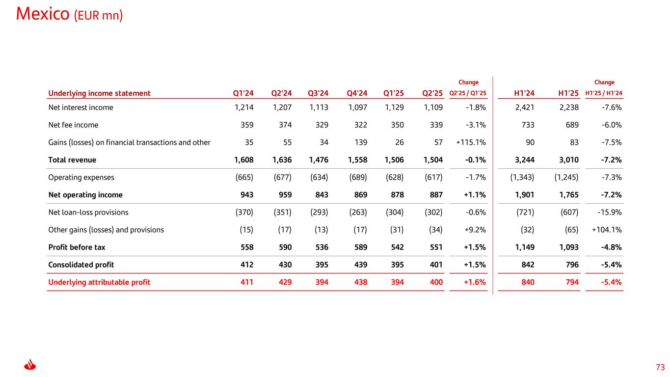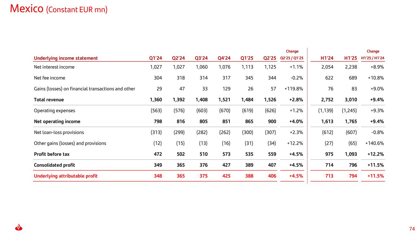 73 Mexico (EUR mn) Change Change Underlying income statement Q1'24 Q2'24 Q3'24 Q4'24 Q1'25 Q2'25 Q2'25 / Q1'25 H1'24 H1'25 H1'25 / H1'24 Net interest income 1,214 1,207 1,113 1,097 1,129 1,109 -1.8% 2,421 2,238 -7.6% Net fee income 359 374 329 322 350 339 -3.1% 733 689 -6.0% Gains (losses) on financial transactions and other 35 55 34 139 26 57 +115.1% 90 83 -7.5% Total revenue 1,608 1,636 1,476 1,558 1,506 1,504 -0.1% 3,244 3,010 -7.2% Operating expenses (665) (677) (634) (689) (628) (617) -1.7% (1,343) (1,245) -7.3% Net operating income 943 959 843 869 878 887 +1.1% 1,901 1,765 -7.2% Net loan-loss provisions (370) (351) (293) (263) (304) (302) -0.6% (721) (607) -15.9% Other gains (losses) and provisions (15) (17) (13) (17) (31) (34) +9.2% (32) (65) +104.1% Profit before tax 558 590 536 589 542 551 +1.5% 1,149 1,093 -4.8% Consolidated profit 412 430 395 439 395 401 +1.5% 842 796 -5.4% Underlying attributable profit 411 429 394 438 394 400 +1.6% 840 794 -5.4%