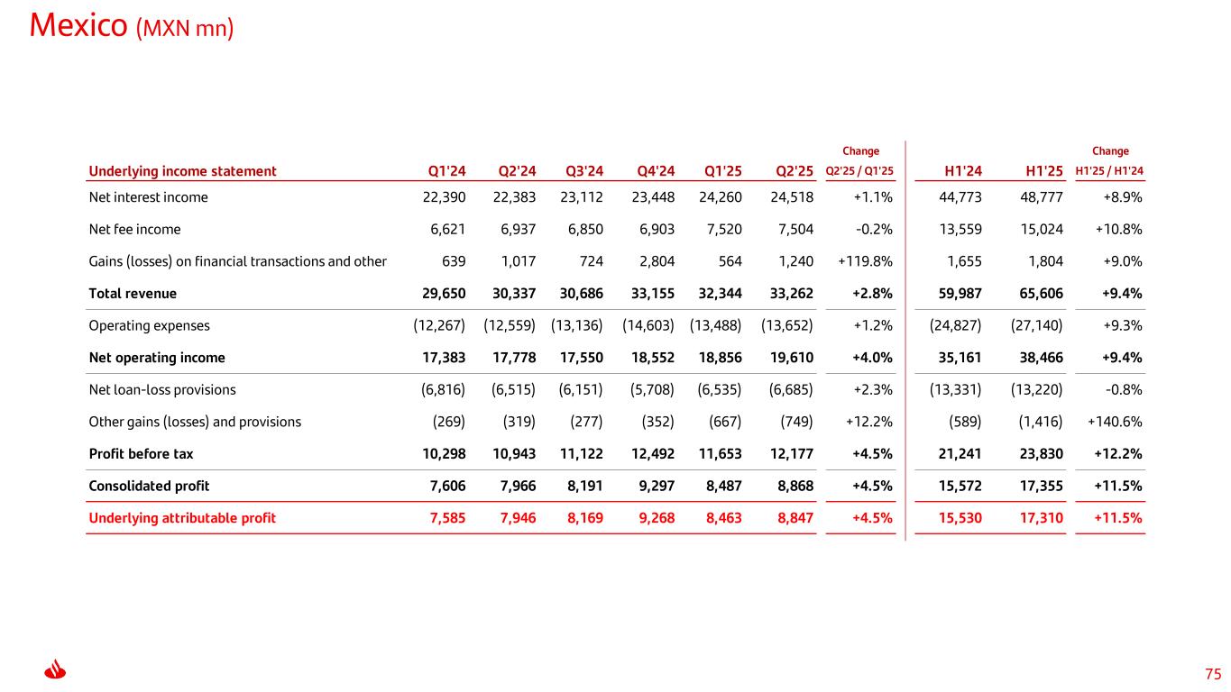 75 Mexico (MXN mn) Change Change Underlying income statement Q1'24 Q2'24 Q3'24 Q4'24 Q1'25 Q2'25 Q2'25 / Q1'25 H1'24 H1'25 H1'25 / H1'24 Net interest income 22,390 22,383 23,112 23,448 24,260 24,518 +1.1% 44,773 48,777 +8.9% Net fee income 6,621 6,937 6,850 6,903 7,520 7,504 -0.2% 13,559 15,024 +10.8% Gains (losses) on financial transactions and other 639 1,017 724 2,804 564 1,240 +119.8% 1,655 1,804 +9.0% Total revenue 29,650 30,337 30,686 33,155 32,344 33,262 +2.8% 59,987 65,606 +9.4% Operating expenses (12,267) (12,559) (13,136) (14,603) (13,488) (13,652) +1.2% (24,827) (27,140) +9.3% Net operating income 17,383 17,778 17,550 18,552 18,856 19,610 +4.0% 35,161 38,466 +9.4% Net loan-loss provisions (6,816) (6,515) (6,151) (5,708) (6,535) (6,685) +2.3% (13,331) (13,220) -0.8% Other gains (losses) and provisions (269) (319) (277) (352) (667) (749) +12.2% (589) (1,416) +140.6% Profit before tax 10,298 10,943 11,122 12,492 11,653 12,177 +4.5% 21,241 23,830 +12.2% Consolidated profit 7,606 7,966 8,191 9,297 8,487 8,868 +4.5% 15,572 17,355 +11.5% Underlying attributable profit 7,585 7,946 8,169 9,268 8,463 8,847 +4.5% 15,530 17,310 +11.5%