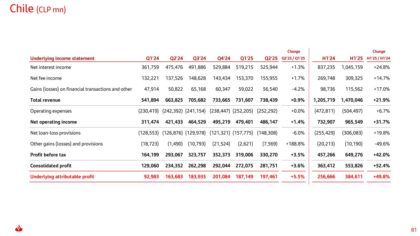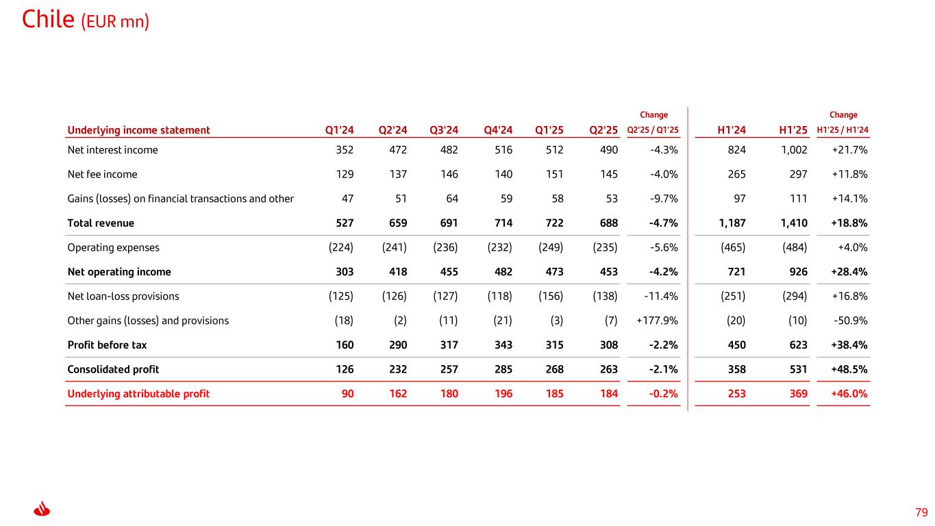 80 Chile (Constant EUR mn) Change Change Underlying income statement Q1'24 Q2'24 Q3'24 Q4'24 Q1'25 Q2'25 Q2'25 / Q1'25 H1'24 H1'25 H1'25 / H1'24 Net interest income 347 456 472 508 498 504 +1.3% 803 1,002 +24.8% Net fee income 127 132 143 138 147 150 +1.7% 259 297 +14.7% Gains (losses) on financial transactions and other 46 49 63 58 57 54 -4.2% 95 111 +17.0% Total revenue 520 637 677 704 702 708 +0.9% 1,156 1,410 +21.9% Operating expenses (221) (232) (231) (229) (242) (242) +0.0% (453) (484) +6.7% Net operating income 299 404 446 475 460 466 +1.4% 703 926 +31.7% Net loan-loss provisions (123) (122) (125) (116) (151) (142) -6.0% (245) (294) +19.8% Other gains (losses) and provisions (18) (1) (10) (21) (3) (7) +188.8% (19) (10) -49.6% Profit before tax 157 281 311 338 306 317 +3.5% 439 623 +42.0% Consolidated profit 124 225 252 280 261 270 +3.6% 349 531 +52.4% Underlying attributable profit 89 157 176 193 179 189 +5.5% 246 369 +49.8%