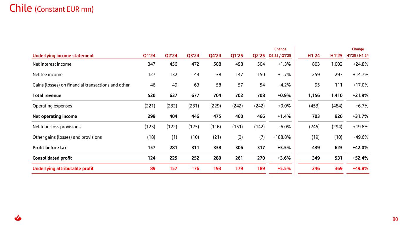 79 Chile (EUR mn) Change Change Underlying income statement Q1'24 Q2'24 Q3'24 Q4'24 Q1'25 Q2'25 Q2'25 / Q1'25 H1'24 H1'25 H1'25 / H1'24 Net interest income 352 472 482 516 512 490 -4.3% 824 1,002 +21.7% Net fee income 129 137 146 140 151 145 -4.0% 265 297 +11.8% Gains (losses) on financial transactions and other 47 51 64 59 58 53 -9.7% 97 111 +14.1% Total revenue 527 659 691 714 722 688 -4.7% 1,187 1,410 +18.8% Operating expenses (224) (241) (236) (232) (249) (235) -5.6% (465) (484) +4.0% Net operating income 303 418 455 482 473 453 -4.2% 721 926 +28.4% Net loan-loss provisions (125) (126) (127) (118) (156) (138) -11.4% (251) (294) +16.8% Other gains (losses) and provisions (18) (2) (11) (21) (3) (7) +177.9% (20) (10) -50.9% Profit before tax 160 290 317 343 315 308 -2.2% 450 623 +38.4% Consolidated profit 126 232 257 285 268 263 -2.1% 358 531 +48.5% Underlying attributable profit 90 162 180 196 185 184 -0.2% 253 369 +46.0%