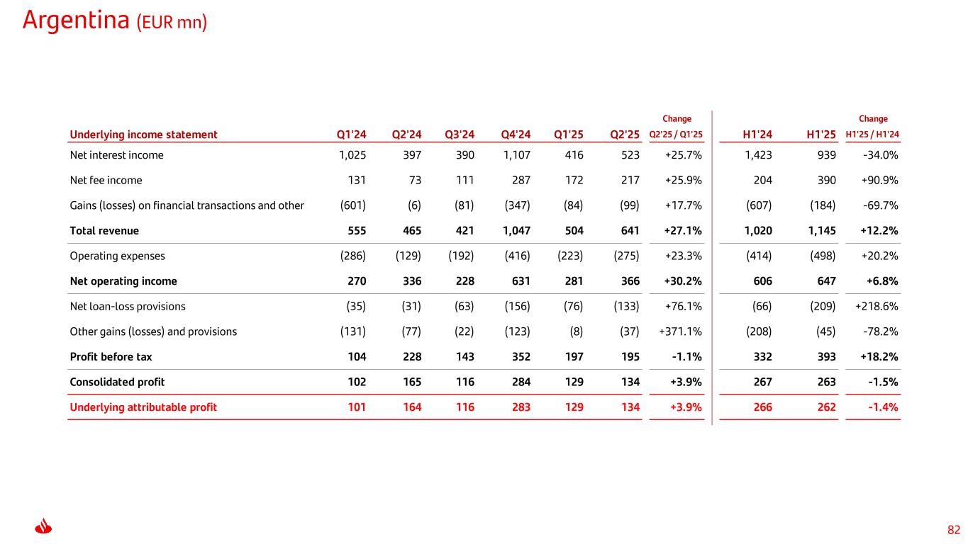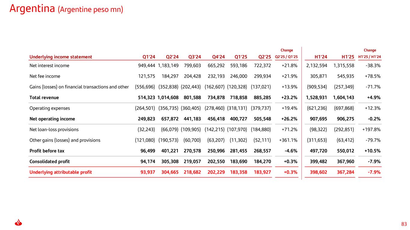 83 Argentina (Argentine peso mn) Change Change Underlying income statement Q1'24 Q2'24 Q3'24 Q4'24 Q1'25 Q2'25 Q2'25 / Q1'25 H1'24 H1'25 H1'25 / H1'24 Net interest income 949,444 1,183,149 799,603 665,292 593,186 722,372 +21.8% 2,132,594 1,315,558 -38.3% Net fee income 121,575 184,297 204,428 232,193 246,000 299,934 +21.9% 305,871 545,935 +78.5% Gains (losses) on financial transactions and other (556,696) (352,838) (202,443) (162,607) (120,328) (137,021) +13.9% (909,534) (257,349) -71.7% Total revenue 514,323 1,014,608 801,588 734,878 718,858 885,285 +23.2% 1,528,931 1,604,143 +4.9% Operating expenses (264,501) (356,735) (360,405) (278,460) (318,131) (379,737) +19.4% (621,236) (697,868) +12.3% Net operating income 249,823 657,872 441,183 456,418 400,727 505,548 +26.2% 907,695 906,275 -0.2% Net loan-loss provisions (32,243) (66,079) (109,905) (142,215) (107,970) (184,880) +71.2% (98,322) (292,851) +197.8% Other gains (losses) and provisions (121,080) (190,573) (60,700) (63,207) (11,302) (52,111) +361.1% (311,653) (63,412) -79.7% Profit before tax 96,499 401,221 270,578 250,996 281,455 268,557 -4.6% 497,720 550,012 +10.5% Consolidated profit 94,174 305,308 219,057 202,550 183,690 184,270 +0.3% 399,482 367,960 -7.9% Underlying attributable profit 93,937 304,665 218,682 202,229 183,358 183,927 +0.3% 398,602 367,284 -7.9%