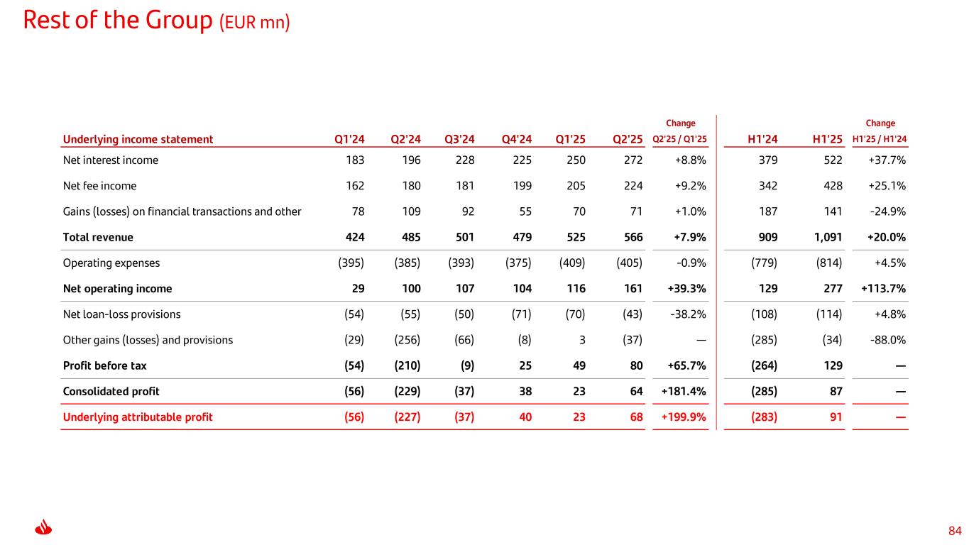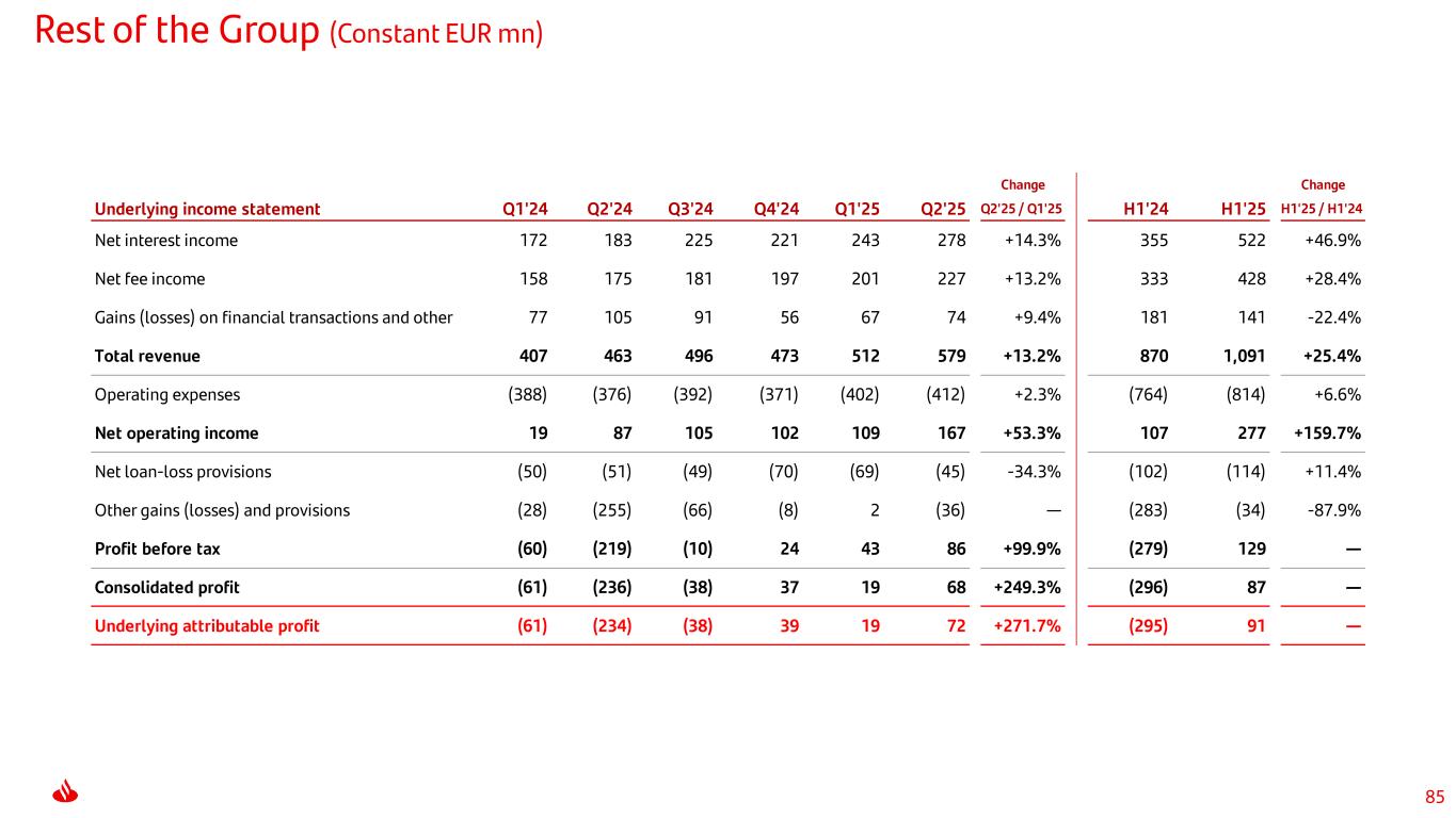 84 Rest of the Group (EUR mn) Change Change Underlying income statement Q1'24 Q2'24 Q3'24 Q4'24 Q1'25 Q2'25 Q2'25 / Q1'25 H1'24 H1'25 H1'25 / H1'24 Net interest income 183 196 228 225 250 272 +8.8% 379 522 +37.7% Net fee income 162 180 181 199 205 224 +9.2% 342 428 +25.1% Gains (losses) on financial transactions and other 78 109 92 55 70 71 +1.0% 187 141 -24.9% Total revenue 424 485 501 479 525 566 +7.9% 909 1,091 +20.0% Operating expenses (395) (385) (393) (375) (409) (405) -0.9% (779) (814) +4.5% Net operating income 29 100 107 104 116 161 +39.3% 129 277 +113.7% Net loan-loss provisions (54) (55) (50) (71) (70) (43) -38.2% (108) (114) +4.8% Other gains (losses) and provisions (29) (256) (66) (8) 3 (37) — (285) (34) -88.0% Profit before tax (54) (210) (9) 25 49 80 +65.7% (264) 129 — Consolidated profit (56) (229) (37) 38 23 64 +181.4% (285) 87 — Underlying attributable profit (56) (227) (37) 40 23 68 +199.9% (283) 91 —
