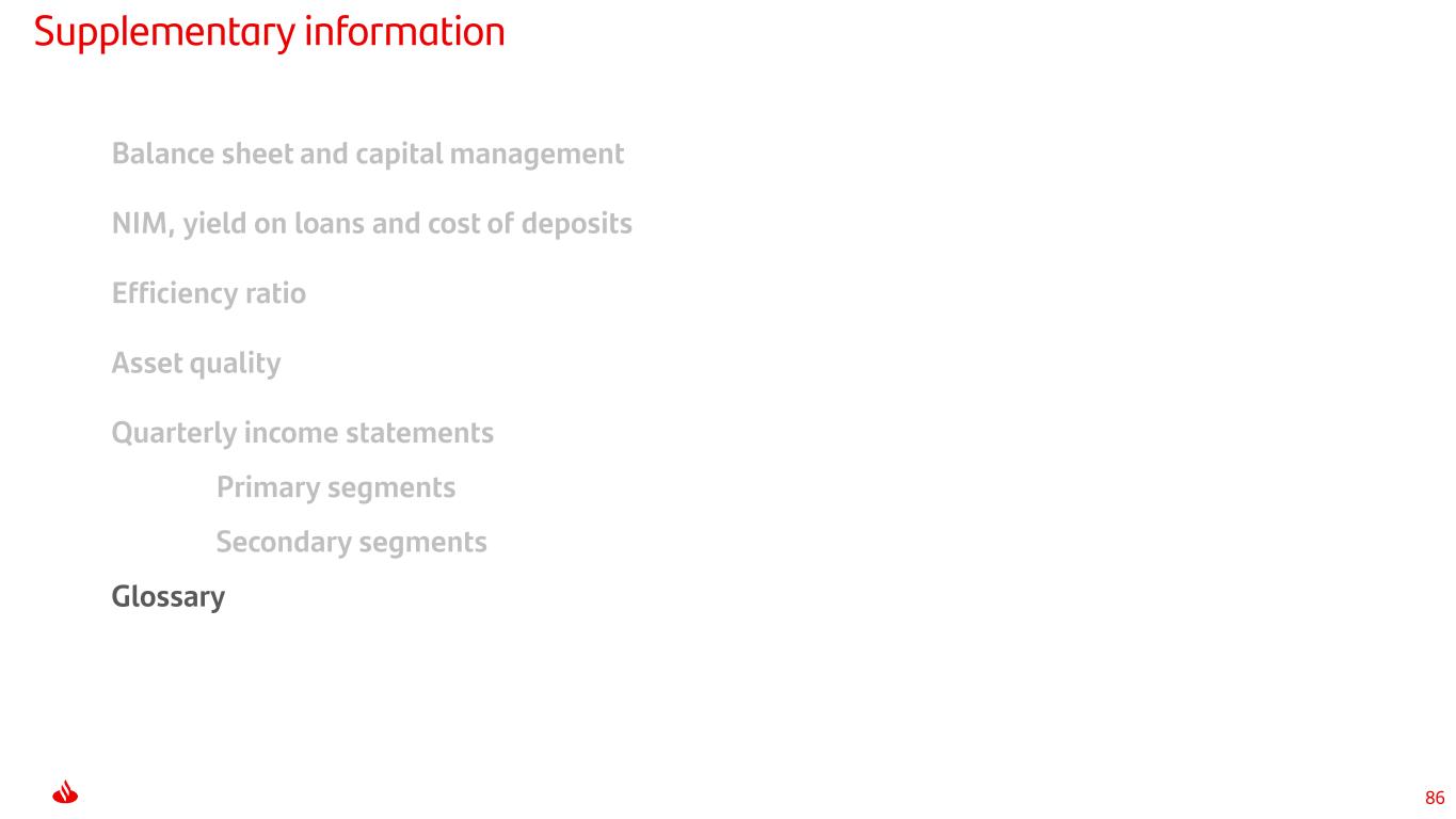86 Supplementary information Balance sheet and capital management NIM, yield on loans and cost of deposits Efficiency ratio Asset quality Quarterly income statements Primary segments Secondary segments Glossary