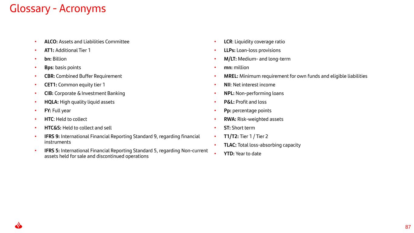 87 Glossary - Acronyms • ALCO: Assets and Liabilities Committee • AT1: Additional Tier 1 • bn: Billion • Bps: basis points • CBR: Combined Buffer Requirement • CET1: Common equity tier 1 • CIB: Corporate & Investment Banking • HQLA: High quality liquid assets • FY: Full year • HTC: Held to collect • HTC&S: Held to collect and sell • IFRS 9: International Financial Reporting Standard 9, regarding financial instruments • IFRS 5: International Financial Reporting Standard 5, regarding Non-current assets held for sale and discontinued operations • LCR: Liquidity coverage ratio • LLPs: Loan-loss provisions • M/LT: Medium- and long-term • mn: million • MREL: Minimum requirement for own funds and eligible liabilities • NII: Net interest income • NPL: Non-performing loans • P&L: Profit and loss • Pp: percentage points • RWA: Risk-weighted assets • ST: Short term • T1/T2: Tier 1 / Tier 2 • TLAC: Total loss-absorbing capacity • YTD: Year to date