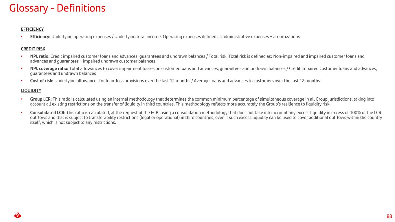 88 Glossary - Definitions EFFICIENCY • Efficiency: Underlying operating expenses / Underlying total income. Operating expenses defined as administrative expenses + amortizations CREDIT RISK • NPL ratio: Credit impaired customer loans and advances, guarantees and undrawn balances / Total risk. Total risk is defined as: Non-impaired and impaired customer loans and advances and guarantees + impaired undrawn customer balances • NPL coverage ratio: Total allowances to cover impairment losses on customer loans and advances, guarantees and undrawn balances / Credit impaired customer loans and advances, guarantees and undrawn balances • Cost of risk: Underlying allowances for loan-loss provisions over the last 12 months / Average loans and advances to customers over the last 12 months LIQUIDITY • Group LCR: This ratio is calculated using an internal methodology that determines the common minimum percentage of simultaneous coverage in all Group jurisdictions, taking into account all existing restrictions on the transfer of liquidity in third countries. This methodology reflects more accurately the Group’s resilience to liquidity risk. • Consolidated LCR: This ratio is calculated, at the request of the ECB, using a consolidation methodology that does not take into account any excess liquidity in excess of 100% of the LCR outflows and that is subject to transferability restrictions (legal or operational) in third countries, even if such excess liquidity can be used to cover additional outflows within the country itself, which is not subject to any restrictions.