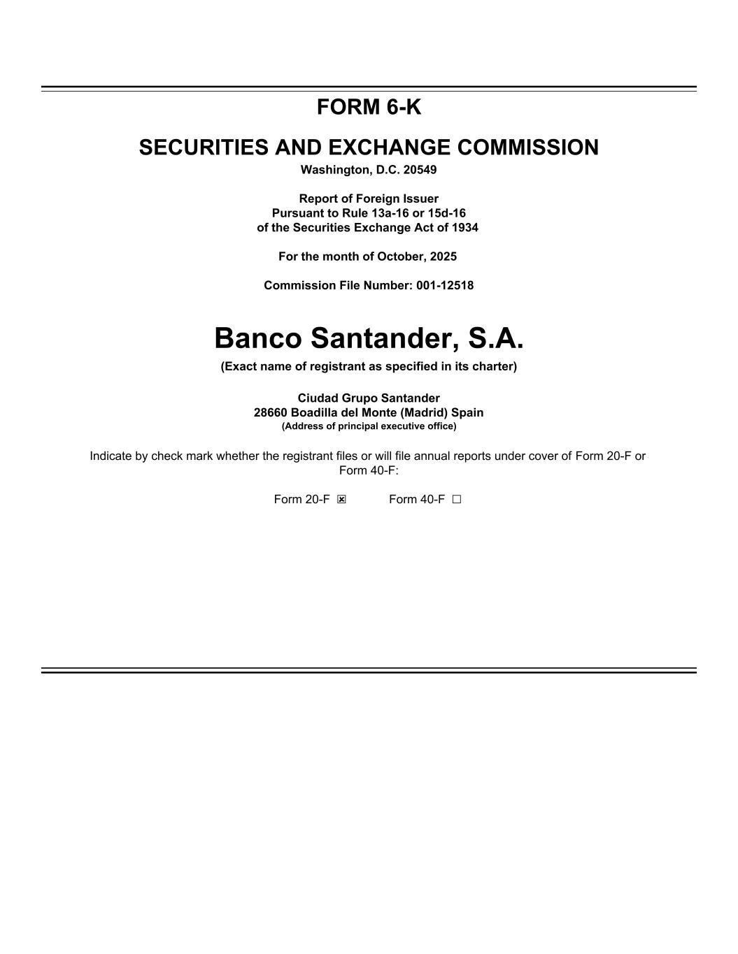 FORM 6-K SECURITIES AND EXCHANGE COMMISSION Washington, D.C. 20549 Report of Foreign Issuer Pursuant to Rule 13a-16 or 15d-16 of the Securities Exchange Act of 1934 For the month of October, 2025 Commission File Number: 001-12518 Banco Santander, S.A. (Exact name of registrant as specified in its charter) Ciudad Grupo Santander 28660 Boadilla del Monte (Madrid) Spain (Address of principal executive office) Indicate by check mark whether the registrant files or will file annual reports under cover of Form 20-F or Form 40-F: Form 20-F ☒ Form 40-F ☐