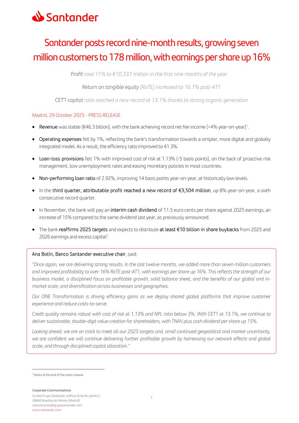 Corporate Communications Ciudad Grupo Santander, edificio Arrecife, planta 2 28660 Boadilla del Monte (Madrid) comunicacion@gruposantander.com www.santander.com 1 Santander posts record nine-month results, growing seven million customers to 178 million, with earnings per share up 16% Profit rose 11% to €10,337 million in the first nine months of the year Return on tangible equity (RoTE) increased to 16.1% post-AT1 CET1 capital ratio reached a new record at 13.1% thanks to strong organic generation Madrid, 29 October 2025 - PRESS RELEASE • Revenue was stable (€46.3 billion), with the bank achieving record net fee income (+4% year-on-year)1.1 • Operating expenses fell by 1%, reflecting the bank’s transformation towards a simpler, more digital and globally integrated model. As a result, the efficiency ratio improved to 41.3%. • Loan-loss provisions fell 1% with improved cost of risk at 1.13% (-5 basis points), on the back of proactive risk management, low unemployment rates and easing monetary policies in most countries. • Non-performing loan ratio of 2.92%, improving 14 basis points year-on-year, at historically low levels. • In the third quarter, attributable profit reached a new record of €3,504 million, up 8% year-on-year, a sixth consecutive record quarter. • In November, the bank will pay an interim cash dividend of 11.5 euro cents per share against 2025 earnings, an increase of 15% compared to the same dividend last year, as previously announced. • The bank reaffirms 2025 targets and expects to distribute at least €10 billion in share buybacks from 2025 and 2026 earnings and excess capital2. Ana Botín, Banco Santander executive chair, said: “Once again, we are delivering strong results. In the last twelve months, we added more than seven million customers and improved profitability to over 16% RoTE post-AT1, with earnings per share up 16%. This reflects the strength of our business model, a disciplined focus on profitable growth, solid balance sheet, and the benefits of our global and in- market scale, and diversification across businesses and geographies. Our ONE Transformation is driving efficiency gains as we deploy shared global platforms that improve customer experience and reduce costs-to-serve. Credit quality remains robust with cost of risk at 1.13% and NPL ratio below 3%. With CET1 at 13.1%, we continue to deliver sustainable, double-digit value creation for shareholders, with TNAV plus cash dividend per share up 15%. Looking ahead, we are on track to meet all our 2025 targets and, amid continued geopolitical and market uncertainty, we are confident we will continue delivering further profitable growth by harnessing our network effects and global scale, and through disciplined capital allocation.” 1 Notes at the end of the press release.