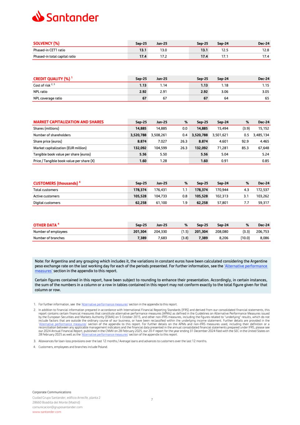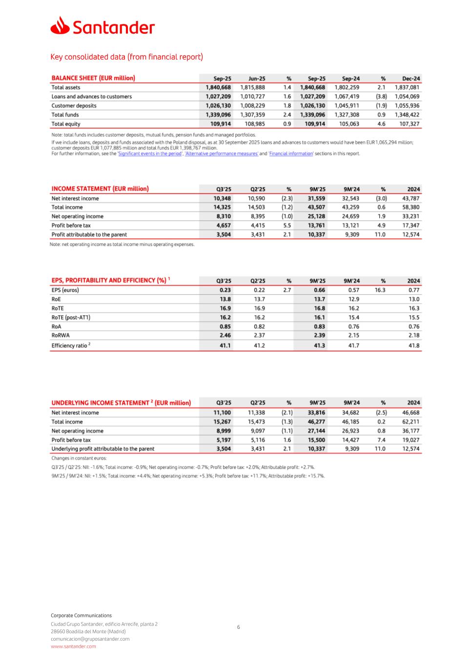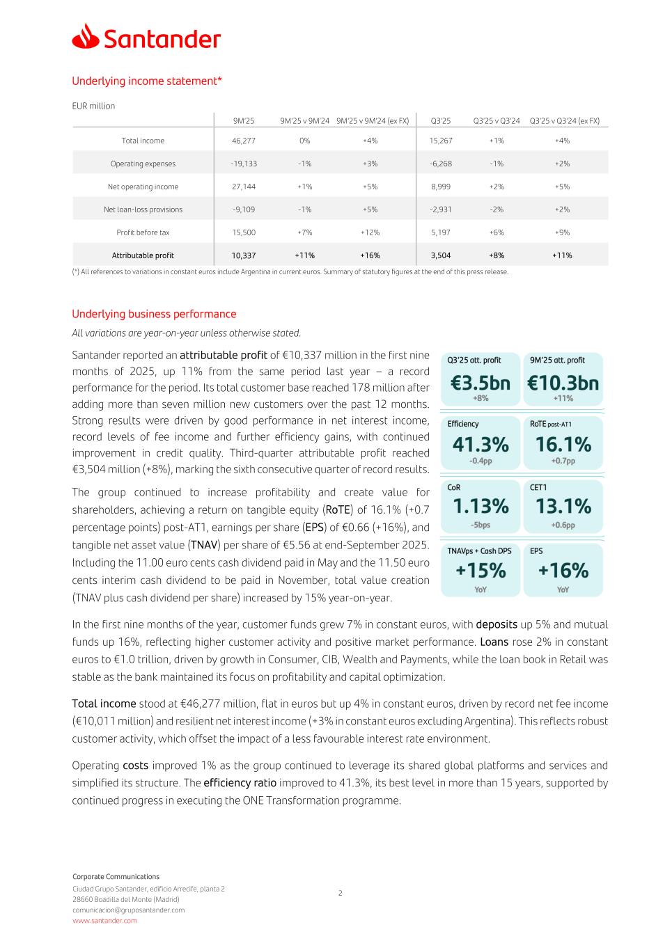 Corporate Communications Ciudad Grupo Santander, edificio Arrecife, planta 2 28660 Boadilla del Monte (Madrid) comunicacion@gruposantander.com www.santander.com 2 Underlying income statement* EUR million 9M’25 9M’25 v 9M’24 9M’25 v 9M’24 (ex FX) Q3’25 Q3’25 v Q3’24 Q3’25 v Q3’24 (ex FX) Total income 46,277 0% +4% 15,267 +1% +4% Operating expenses -19,133 -1% +3% -6,268 -1% +2% Net operating income 27,144 +1% +5% 8,999 +2% +5% Net loan-loss provisions -9,109 -1% +5% -2,931 -2% +2% Profit before tax 15,500 +7% +12% 5,197 +6% +9% Attributable profit 10,337 +11% +16% 3,504 +8% +11% (*) All references to variations in constant euros include Argentina in current euros. Summary of statutory figures at the end of this press release. Underlying business performance All variations are year-on-year unless otherwise stated. Santander reported an attributable profit of €10,337 million in the first nine months of 2025, up 11% from the same period last year – a record performance for the period. Its total customer base reached 178 million after adding more than seven million new customers over the past 12 months. Strong results were driven by good performance in net interest income, record levels of fee income and further efficiency gains, with continued improvement in credit quality. Third-quarter attributable profit reached €3,504 million (+8%), marking the sixth consecutive quarter of record results. The group continued to increase profitability and create value for shareholders, achieving a return on tangible equity (RoTE) of 16.1% (+0.7 percentage points) post-AT1, earnings per share (EPS) of €0.66 (+16%), and tangible net asset value (TNAV) per share of €5.56 at end-September 2025. Including the 11.00 euro cents cash dividend paid in May and the 11.50 euro cents interim cash dividend to be paid in November, total value creation (TNAV plus cash dividend per share) increased by 15% year-on-year. In the first nine months of the year, customer funds grew 7% in constant euros, with deposits up 5% and mutual funds up 16%, reflecting higher customer activity and positive market performance. Loans rose 2% in constant euros to €1.0 trillion, driven by growth in Consumer, CIB, Wealth and Payments, while the loan book in Retail was stable as the bank maintained its focus on profitability and capital optimization. Total income stood at €46,277 million, flat in euros but up 4% in constant euros, driven by record net fee income (€10,011 million) and resilient net interest income (+3% in constant euros excluding Argentina). This reflects robust customer activity, which offset the impact of a less favourable interest rate environment. Operating costs improved 1% as the group continued to leverage its shared global platforms and services and simplified its structure. The efficiency ratio improved to 41.3%, its best level in more than 15 years, supported by continued progress in executing the ONE Transformation programme.