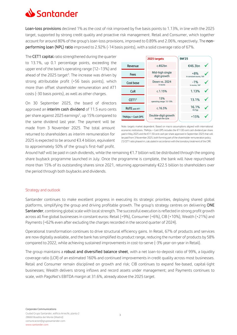 Corporate Communications Ciudad Grupo Santander, edificio Arrecife, planta 2 28660 Boadilla del Monte (Madrid) comunicacion@gruposantander.com www.santander.com 3 Loan-loss provisions declined 1% as the cost of risk improved by five basis points to 1.13%, in line with the 2025 target, supported by strong credit quality and proactive risk management. Retail and Consumer, which together account for around 80% of the group’s loan-loss provisions, improved to 0.89% and 2.06%, respectively. The non- performing loan (NPL) ratio improved to 2.92% (-14 basis points), with a solid coverage ratio of 67%. The CET1 capital ratio strengthened during the quarter to 13.1%, up 0.1 percentage points, exceeding the upper end of the bank’s operating range (12–13%) and ahead of the 2025 target3. The increase was driven by strong attributable profit (+56 basis points), which more than offset shareholder remuneration and AT1 costs (-30 basis points), as well as other charges. On 30 September 2025, the board of directors approved an interim cash dividend of 11.5 euro cents per share against 2025 earnings2, up 15% compared to the same dividend last year. The payment will be made from 3 November 2025. The total amount returned to shareholders as interim remuneration for 2025 is expected to be around €3.4 billion, equivalent to approximately 50% of the group’s first-half profit. Around half will be paid in cash dividends, while the remaining €1.7 billion will be distributed through the ongoing share buyback programme launched in July. Once the programme is complete, the bank will have repurchased more than 15% of its outstanding shares since 2021, returning approximately €22.5 billion to shareholders over the period through both buybacks and dividends. Strategy and outlook Santander continues to make excellent progress in executing its strategic priorities, deploying shared global platforms, simplifying the group and driving profitable growth. The group’s strategy centres on delivering ONE Santander, combining global scale with local strength. The successful execution is reflected in strong profit growth across all five global businesses in constant euros: Retail (+9%), Consumer (+6%), CIB (+10%), Wealth (+21%) and Payments (+62% even after excluding the charges recorded in the second quarter of 2024). Operational transformation continues to drive structural efficiency gains. In Retail, 67% of products and services are now digitally available, and the bank has simplified its product range, reducing the number of products by 58% compared to 2022, while achieving sustained improvements in cost-to-serve (-3% year-on-year in Retail). The group maintains a robust and diversified balance sheet, with a net loan-to-deposit ratio of 99%, a liquidity coverage ratio (LCR) of an estimated 160% and continued improvements in credit quality across most businesses. Retail and Consumer remain disciplined on growth and risk; CIB continues to expand fee-based, capital-light businesses; Wealth delivers strong inflows and record assets under management; and Payments continues to scale, with PagoNxt’s EBITDA margin at 31.6%, already above the 2025 target. Note: targets market dependent. Based on macro assumptions aligned with international economic institutions. TNAVps + Cash DPS includes the €11.00 cent cash dividend per share paid in May 2025 and the €11.50 cent cash per share approved in September 2025 that will be paid from 3 November 2025, both forming part of the shareholder remuneration policy. (1) CET1 ratio phased-in, calculated in accordance with the transitory treatment of the CRR.
