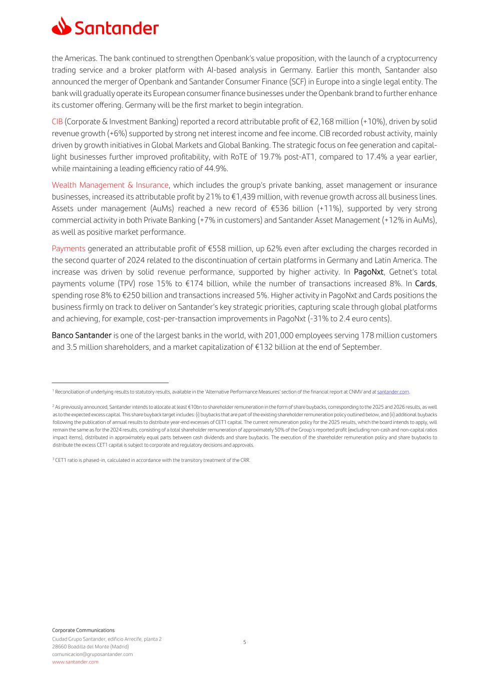 Corporate Communications Ciudad Grupo Santander, edificio Arrecife, planta 2 28660 Boadilla del Monte (Madrid) comunicacion@gruposantander.com www.santander.com 5 the Americas. The bank continued to strengthen Openbank’s value proposition, with the launch of a cryptocurrency trading service and a broker platform with AI-based analysis in Germany. Earlier this month, Santander also announced the merger of Openbank and Santander Consumer Finance (SCF) in Europe into a single legal entity. The bank will gradually operate its European consumer finance businesses under the Openbank brand to further enhance its customer offering. Germany will be the first market to begin integration. CIB (Corporate & Investment Banking) reported a record attributable profit of €2,168 million (+10%), driven by solid revenue growth (+6%) supported by strong net interest income and fee income. CIB recorded robust activity, mainly driven by growth initiatives in Global Markets and Global Banking. The strategic focus on fee generation and capital- light businesses further improved profitability, with RoTE of 19.7% post-AT1, compared to 17.4% a year earlier, while maintaining a leading efficiency ratio of 44.9%. Wealth Management & Insurance, which includes the group’s private banking, asset management or insurance businesses, increased its attributable profit by 21% to €1,439 million, with revenue growth across all business lines. Assets under management (AuMs) reached a new record of €536 billion (+11%), supported by very strong commercial activity in both Private Banking (+7% in customers) and Santander Asset Management (+12% in AuMs), as well as positive market performance. Payments generated an attributable profit of €558 million, up 62% even after excluding the charges recorded in the second quarter of 2024 related to the discontinuation of certain platforms in Germany and Latin America. The increase was driven by solid revenue performance, supported by higher activity. In PagoNxt, Getnet’s total payments volume (TPV) rose 15% to €174 billion, while the number of transactions increased 8%. In Cards, spending rose 8% to €250 billion and transactions increased 5%. Higher activity in PagoNxt and Cards positions the business firmly on track to deliver on Santander’s key strategic priorities, capturing scale through global platforms and achieving, for example, cost-per-transaction improvements in PagoNxt (-31% to 2.4 euro cents). Banco Santander is one of the largest banks in the world, with 201,000 employees serving 178 million customers and 3.5 million shareholders, and a market capitalization of €132 billion at the end of September. 1 Reconciliation of underlying results to statutory results, available in the ‘Alternative Performance Measures’ section of the financial report at CNMV and at santander.com. 2 As previously announced, Santander intends to allocate at least €10bn to shareholder remuneration in the form of share buybacks, corresponding to the 2025 and 2026 results, as well as to the expected excess capital. This share buyback target includes: (i) buybacks that are part of the existing shareholder remuneration policy outlined below, and (ii) additional buybacks following the publication of annual results to distribute year-end excesses of CET1 capital. The current remuneration policy for the 2025 results, which the board intends to apply, will remain the same as for the 2024 results, consisting of a total shareholder remuneration of approximately 50% of the Group's reported profit (excluding non-cash and non-capital ratios impact items), distributed in approximately equal parts between cash dividends and share buybacks. The execution of the shareholder remuneration policy and share buybacks to distribute the excess CET1 capital is subject to corporate and regulatory decisions and approvals. 3 CET1 ratio is phased-in, calculated in accordance with the transitory treatment of the CRR.