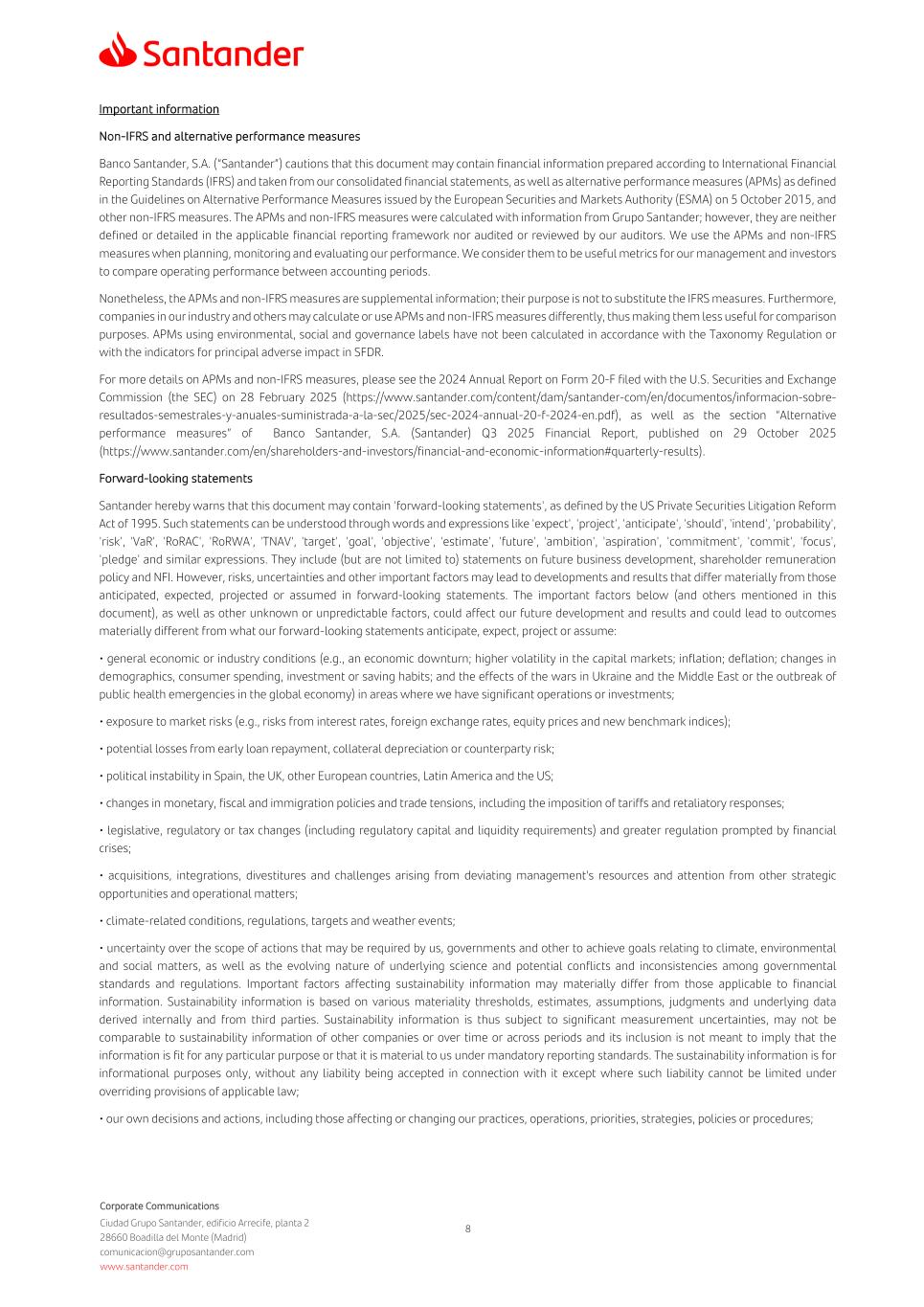 Corporate Communications Ciudad Grupo Santander, edificio Arrecife, planta 2 28660 Boadilla del Monte (Madrid) comunicacion@gruposantander.com www.santander.com 8 Important information Non-IFRS and alternative performance measures Banco Santander, S.A. (“Santander”) cautions that this document may contain financial information prepared according to International Financial Reporting Standards (IFRS) and taken from our consolidated financial statements, as well as alternative performance measures (APMs) as defined in the Guidelines on Alternative Performance Measures issued by the European Securities and Markets Authority (ESMA) on 5 October 2015, and other non-IFRS measures. The APMs and non-IFRS measures were calculated with information from Grupo Santander; however, they are neither defined or detailed in the applicable financial reporting framework nor audited or reviewed by our auditors. We use the APMs and non-IFRS measures when planning, monitoring and evaluating our performance. We consider them to be useful metrics for our management and investors to compare operating performance between accounting periods. Nonetheless, the APMs and non-IFRS measures are supplemental information; their purpose is not to substitute the IFRS measures. Furthermore, companies in our industry and others may calculate or use APMs and non-IFRS measures differently, thus making them less useful for comparison purposes. APMs using environmental, social and governance labels have not been calculated in accordance with the Taxonomy Regulation or with the indicators for principal adverse impact in SFDR. For more details on APMs and non-IFRS measures, please see the 2024 Annual Report on Form 20-F filed with the U.S. Securities and Exchange Commission (the SEC) on 28 February 2025 (https://www.santander.com/content/dam/santander-com/en/documentos/informacion-sobre- resultados-semestrales-y-anuales-suministrada-a-la-sec/2025/sec-2024-annual-20-f-2024-en.pdf), as well as the section “Alternative performance measures” of Banco Santander, S.A. (Santander) Q3 2025 Financial Report, published on 29 October 2025 (https://www.santander.com/en/shareholders-and-investors/financial-and-economic-information#quarterly-results). Forward-looking statements Santander hereby warns that this document may contain 'forward-looking statements', as defined by the US Private Securities Litigation Reform Act of 1995. Such statements can be understood through words and expressions like 'expect', 'project', 'anticipate', 'should', 'intend', 'probability', 'risk', 'VaR', 'RoRAC', 'RoRWA', 'TNAV', 'target', 'goal', 'objective', 'estimate', 'future', 'ambition', 'aspiration', 'commitment', 'commit', 'focus', 'pledge' and similar expressions. They include (but are not limited to) statements on future business development, shareholder remuneration policy and NFI. However, risks, uncertainties and other important factors may lead to developments and results that differ materially from those anticipated, expected, projected or assumed in forward-looking statements. The important factors below (and others mentioned in this document), as well as other unknown or unpredictable factors, could affect our future development and results and could lead to outcomes materially different from what our forward-looking statements anticipate, expect, project or assume: • general economic or industry conditions (e.g., an economic downturn; higher volatility in the capital markets; inflation; deflation; changes in demographics, consumer spending, investment or saving habits; and the effects of the wars in Ukraine and the Middle East or the outbreak of public health emergencies in the global economy) in areas where we have significant operations or investments; • exposure to market risks (e.g., risks from interest rates, foreign exchange rates, equity prices and new benchmark indices); • potential losses from early loan repayment, collateral depreciation or counterparty risk; • political instability in Spain, the UK, other European countries, Latin America and the US; • changes in monetary, fiscal and immigration policies and trade tensions, including the imposition of tariffs and retaliatory responses; • legislative, regulatory or tax changes (including regulatory capital and liquidity requirements) and greater regulation prompted by financial crises; • acquisitions, integrations, divestitures and challenges arising from deviating management’s resources and attention from other strategic opportunities and operational matters; • climate-related conditions, regulations, targets and weather events; • uncertainty over the scope of actions that may be required by us, governments and other to achieve goals relating to climate, environmental and social matters, as well as the evolving nature of underlying science and potential conflicts and inconsistencies among governmental standards and regulations. Important factors affecting sustainability information may materially differ from those applicable to financial information. Sustainability information is based on various materiality thresholds, estimates, assumptions, judgments and underlying data derived internally and from third parties. Sustainability information is thus subject to significant measurement uncertainties, may not be comparable to sustainability information of other companies or over time or across periods and its inclusion is not meant to imply that the information is fit for any particular purpose or that it is material to us under mandatory reporting standards. The sustainability information is for informational purposes only, without any liability being accepted in connection with it except where such liability cannot be limited under overriding provisions of applicable law; • our own decisions and actions, including those affecting or changing our practices, operations, priorities, strategies, policies or procedures;
