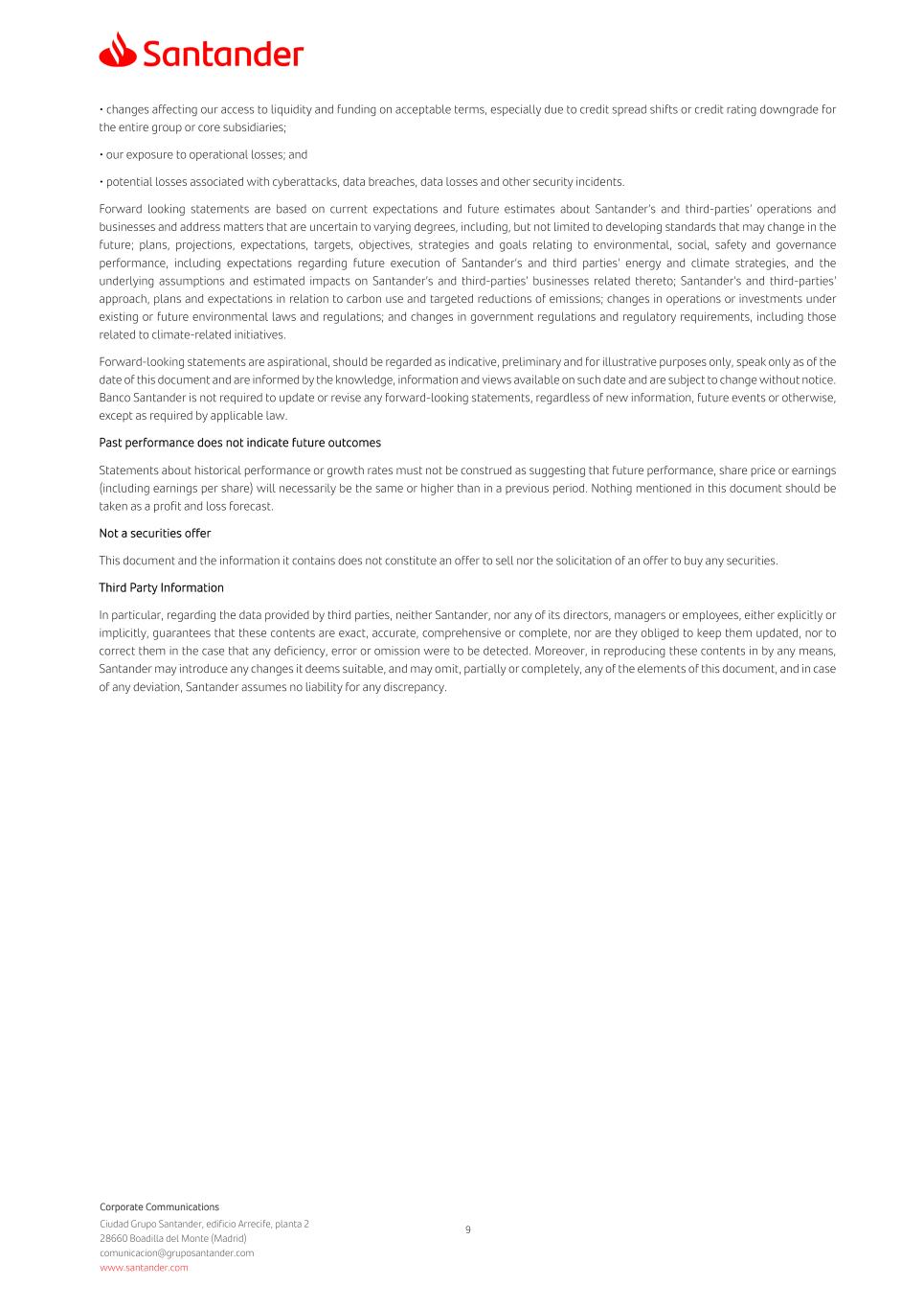 Corporate Communications Ciudad Grupo Santander, edificio Arrecife, planta 2 28660 Boadilla del Monte (Madrid) comunicacion@gruposantander.com www.santander.com 9 • changes affecting our access to liquidity and funding on acceptable terms, especially due to credit spread shifts or credit rating downgrade for the entire group or core subsidiaries; • our exposure to operational losses; and • potential losses associated with cyberattacks, data breaches, data losses and other security incidents. Forward looking statements are based on current expectations and future estimates about Santander’s and third-parties’ operations and businesses and address matters that are uncertain to varying degrees, including, but not limited to developing standards that may change in the future; plans, projections, expectations, targets, objectives, strategies and goals relating to environmental, social, safety and governance performance, including expectations regarding future execution of Santander’s and third parties’ energy and climate strategies, and the underlying assumptions and estimated impacts on Santander’s and third-parties’ businesses related thereto; Santander’s and third-parties’ approach, plans and expectations in relation to carbon use and targeted reductions of emissions; changes in operations or investments under existing or future environmental laws and regulations; and changes in government regulations and regulatory requirements, including those related to climate-related initiatives. Forward-looking statements are aspirational, should be regarded as indicative, preliminary and for illustrative purposes only, speak only as of the date of this document and are informed by the knowledge, information and views available on such date and are subject to change without notice. Banco Santander is not required to update or revise any forward-looking statements, regardless of new information, future events or otherwise, except as required by applicable law. Past performance does not indicate future outcomes Statements about historical performance or growth rates must not be construed as suggesting that future performance, share price or earnings (including earnings per share) will necessarily be the same or higher than in a previous period. Nothing mentioned in this document should be taken as a profit and loss forecast. Not a securities offer This document and the information it contains does not constitute an offer to sell nor the solicitation of an offer to buy any securities. Third Party Information In particular, regarding the data provided by third parties, neither Santander, nor any of its directors, managers or employees, either explicitly or implicitly, guarantees that these contents are exact, accurate, comprehensive or complete, nor are they obliged to keep them updated, nor to correct them in the case that any deficiency, error or omission were to be detected. Moreover, in reproducing these contents in by any means, Santander may introduce any changes it deems suitable, and may omit, partially or completely, any of the elements of this document, and in case of any deviation, Santander assumes no liability for any discrepancy.