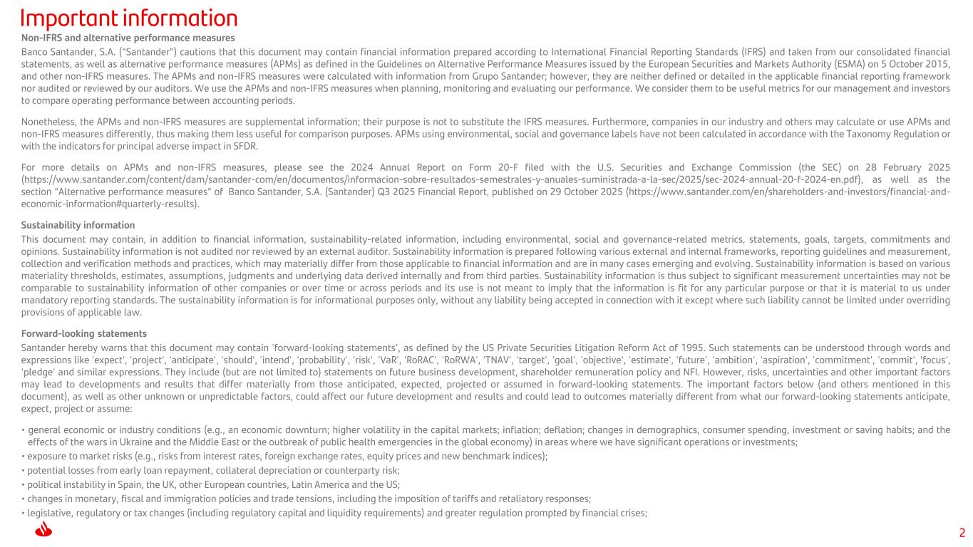 2 Important information Non-IFRS and alternative performance measures Banco Santander, S.A. (“Santander”) cautions that this document may contain financial information prepared according to International Financial Reporting Standards (IFRS) and taken from our consolidated financial statements, as well as alternative performance measures (APMs) as defined in the Guidelines on Alternative Performance Measures issued by the European Securities and Markets Authority (ESMA) on 5 October 2015, and other non-IFRS measures. The APMs and non-IFRS measures were calculated with information from Grupo Santander; however, they are neither defined or detailed in the applicable financial reporting framework nor audited or reviewed by our auditors. We use the APMs and non-IFRS measures when planning, monitoring and evaluating our performance. We consider them to be useful metrics for our management and investors to compare operating performance between accounting periods. Nonetheless, the APMs and non-IFRS measures are supplemental information; their purpose is not to substitute the IFRS measures. Furthermore, companies in our industry and others may calculate or use APMs and non-IFRS measures differently, thus making them less useful for comparison purposes. APMs using environmental, social and governance labels have not been calculated in accordance with the Taxonomy Regulation or with the indicators for principal adverse impact in SFDR. For more details on APMs and non-IFRS measures, please see the 2024 Annual Report on Form 20-F filed with the U.S. Securities and Exchange Commission (the SEC) on 28 February 2025 (https://www.santander.com/content/dam/santander-com/en/documentos/informacion-sobre-resultados-semestrales-y-anuales-suministrada-a-la-sec/2025/sec-2024-annual-20-f-2024-en.pdf), as well as the section “Alternative performance measures” of Banco Santander, S.A. (Santander) Q3 2025 Financial Report, published on 29 October 2025 (https://www.santander.com/en/shareholders-and-investors/financial-and- economic-information#quarterly-results). Sustainability information This document may contain, in addition to financial information, sustainability-related information, including environmental, social and governance-related metrics, statements, goals, targets, commitments and opinions. Sustainability information is not audited nor reviewed by an external auditor. Sustainability information is prepared following various external and internal frameworks, reporting guidelines and measurement, collection and verification methods and practices, which may materially differ from those applicable to financial information and are in many cases emerging and evolving. Sustainability information is based on various materiality thresholds, estimates, assumptions, judgments and underlying data derived internally and from third parties. Sustainability information is thus subject to significant measurement uncertainties may not be comparable to sustainability information of other companies or over time or across periods and its use is not meant to imply that the information is fit for any particular purpose or that it is material to us under mandatory reporting standards. The sustainability information is for informational purposes only, without any liability being accepted in connection with it except where such liability cannot be limited under overriding provisions of applicable law. Forward-looking statements Santander hereby warns that this document may contain 'forward-looking statements', as defined by the US Private Securities Litigation Reform Act of 1995. Such statements can be understood through words and expressions like 'expect', 'project', 'anticipate', 'should', 'intend', 'probability', 'risk', 'VaR', 'RoRAC', 'RoRWA', 'TNAV', 'target', 'goal', 'objective', 'estimate', 'future', 'ambition', 'aspiration', 'commitment', 'commit', 'focus', 'pledge' and similar expressions. They include (but are not limited to) statements on future business development, shareholder remuneration policy and NFI. However, risks, uncertainties and other important factors may lead to developments and results that differ materially from those anticipated, expected, projected or assumed in forward-looking statements. The important factors below (and others mentioned in this document), as well as other unknown or unpredictable factors, could affect our future development and results and could lead to outcomes materially different from what our forward-looking statements anticipate, expect, project or assume: • general economic or industry conditions (e.g., an economic downturn; higher volatility in the capital markets; inflation; deflation; changes in demographics, consumer spending, investment or saving habits; and the effects of the wars in Ukraine and the Middle East or the outbreak of public health emergencies in the global economy) in areas where we have significant operations or investments; • exposure to market risks (e.g., risks from interest rates, foreign exchange rates, equity prices and new benchmark indices); • potential losses from early loan repayment, collateral depreciation or counterparty risk; • political instability in Spain, the UK, other European countries, Latin America and the US; • changes in monetary, fiscal and immigration policies and trade tensions, including the imposition of tariffs and retaliatory responses; • legislative, regulatory or tax changes (including regulatory capital and liquidity requirements) and greater regulation prompted by financial crises;