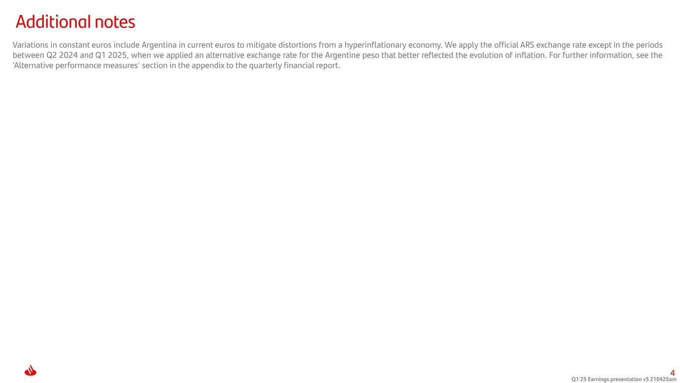 4 Variations in constant euros include Argentina in current euros to mitigate distortions from a hyperinflationary economy. We apply the official ARS exchange rate except in the periods between Q2 2024 and Q1 2025, when we applied an alternative exchange rate for the Argentine peso that better reflected the evolution of inflation. For further information, see the 'Alternative performance measures' section in the appendix to the quarterly financial report. Q1'25 Earnings presentation v5 210425am Additional notes