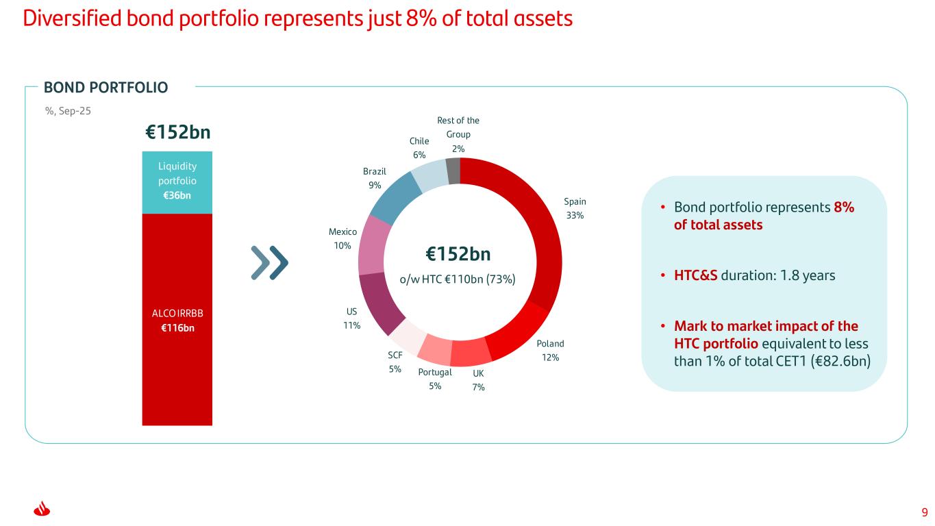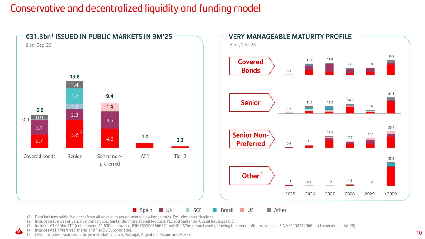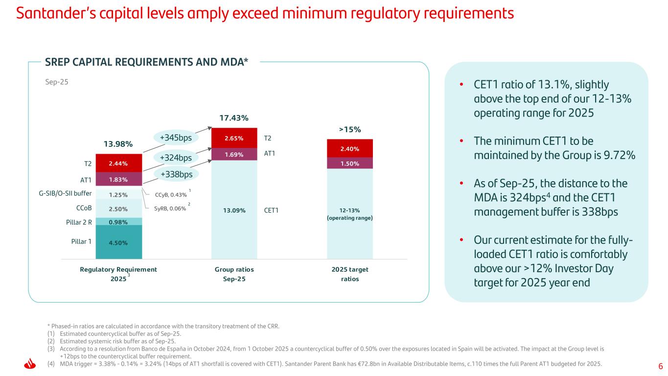 3 Important information • acquisitions, integrations, divestitures and challenges arising from deviating management’s resources and attention from other strategic opportunities and operational matters; • climate-related conditions, regulations, targets and weather events; • uncertainty over the scope of actions that may be required by us, governments and other to achieve goals relating to climate, environmental and social matters, as well as the evolving nature of underlying science and potential conflicts and inconsistencies among governmental standards and regulations. Important factors affecting sustainability information may materially differ from those applicable to financial information. Sustainability information is based on various materiality thresholds, estimates, assumptions, judgments and underlying data derived internally and from third parties. Sustainability information is thus subject to significant measurement uncertainties, may not be comparable to sustainability information of other companies or over time or across periods and its inclusion is not meant to imply that the information is fit for any particular purpose or that it is material to us under mandatory reporting standards. The sustainability information is for informational purposes only, without any liability being accepted in connection with it except where such liability cannot be limited under overriding provisions of applicable law; • our own decisions and actions, including those affecting or changing our practices, operations, priorities, strategies, policies or procedures; • changes affecting our access to liquidity and funding on acceptable terms, especially due to credit spread shifts or credit rating downgrade for the entire group or core subsidiaries; • our exposure to operational losses; and • potential losses associated with cyberattacks, data breaches, data losses and other security incidents Forward looking statements are based on current expectations and future estimates about Santander’s and third-parties’ operations and businesses and address matters that are uncertain to varying degrees, including, but not limited to developing standards that may change in the future; plans, projections, expectations, targets, objectives, strategies and goals relating to environmental, social, safety and governance performance, including expectations regarding future execution of Santander’s and third parties’ energy and climate strategies, and the underlying assumptions and estimated impacts on Santander’s and third-parties’ businesses related thereto; Santander’s and third-parties’ approach, plans and expectations in relation to carbon use and targeted reductions of emissions; changes in operations or investments under existing or future environmental laws and regulations; and changes in government regulations and regulatory requirements, including those related to climate-related initiatives. Forward-looking statements are aspirational, should be regarded as indicative, preliminary and for illustrative purposes only, speak only as of the date of this document and are informed by the knowledge, information and views available on such date and are subject to change without notice. Banco Santander is not required to update or revise any forward-looking statements, regardless of new information, future events or otherwise, except as required by applicable law. Past performance does not indicate future outcomes Statements about historical performance or growth rates must not be construed as suggesting that future performance, share price or earnings (including earnings per share) will necessarily be the same or higher than in a previous period. Nothing mentioned in this document should be taken as a profit and loss forecast. Not a securities offer This document and the information it contains, does not constitute an offer to sell nor the solicitation of an offer to buy any securities. Third Party Information In particular, regarding the data provided by third parties, neither Santander, nor any of its directors, managers or employees, either explicitly or implicitly, guarantees that these contents are exact, accurate, comprehensive or complete, nor are they obliged to keep them updated, nor to correct them in the case that any deficiency, error or omission were to be detected. Moreover, in reproducing these contents in by any means, Santander may introduce any changes it deems suitable, and may omit, partially or completely, any of the elements of this document, and in case of any deviation, Santander assumes no liability for any discrepancy. Sale of 49% stake in Santander Bank Polska to Erste Group All figures, including P&L, loans and advances to customers, customer funds and other metrics are presented on an underlying basis and include Santander Bank Polska, in line with previously published quarterly information, i.e. maintaining the same perimeter that existed at the time of the announcement of the sale of 49% stake in Santander Bank Polska to Erste Group (https://www.santander.com/content/dam/santander- com/en/documentos/informacion-privilegiada/2025/05/hr-2025-05-05-santander-announces-the-sale-of-49-per-cent-of-santander-polska-to-erste-group-bank-and-agrees-strategic-cooperation-across-cib-and- payments-en.pdf). For further information, see the 'Alternative performance measures' section of Banco Santander, S.A. (Santander) Q3 2025 Financial Report, published on 29 October 2025 (https://www.santander.com/en/shareholders-and-investors/financial-and-economic-information#quarterly-results).