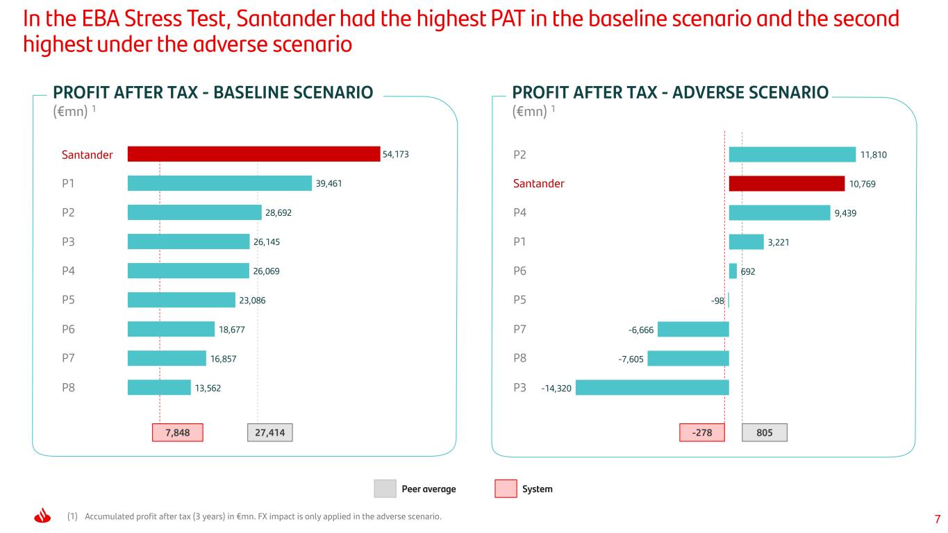 6 Santander’s capital levels amply exceed minimum regulatory requirements * Phased-in ratios are calculated in accordance with the transitory treatment of the CRR. (1) Estimated countercyclical buffer as of Sep-25. (2) Estimated systemic risk buffer as of Sep-25. (3) According to a resolution from Banco de España in October 2024, from 1 October 2025 a countercyclical buffer of 0.50% over the exposures located in Spain will be activated. The impact at the Group level is +12bps to the countercyclical buffer requirement. (4) MDA trigger = 3.38% - 0.14% = 3.24% (14bps of AT1 shortfall is covered with CET1). Santander Parent Bank has €72.8bn in Available Distributable Items, c.110 times the full Parent AT1 budgeted for 2025. 4.50% 13.09% 12-13% (operating range) 0.98% 2.50% 1.25% SyRB, 0.06% CCyB, 0.43% 1.83% 1.69% 1.50%2.44% 2.65% 2.40% 13.98% 17.43% >15% Regulatory Requirement 2025 Group ratios Sep-25 2025 target ratios CET1CCoB Pillar 1 AT1 G-SIB/O-SII buffer T2 T2 AT1 Pillar 2 R Sep-25 +345bps +324bps 1 2 +338bps SREP CAPITAL REQUIREMENTS AND MDA* • CET1 ratio of 13.1%, slightly above the top end of our 12-13% operating range for 2025 • The minimum CET1 to be maintained by the Group is 9.72% • As of Sep-25, the distance to the MDA is 324bps4 and the CET1 management buffer is 338bps • Our current estimate for the fully- loaded CET1 ratio is comfortably above our >12% Investor Day target for 2025 year end 3