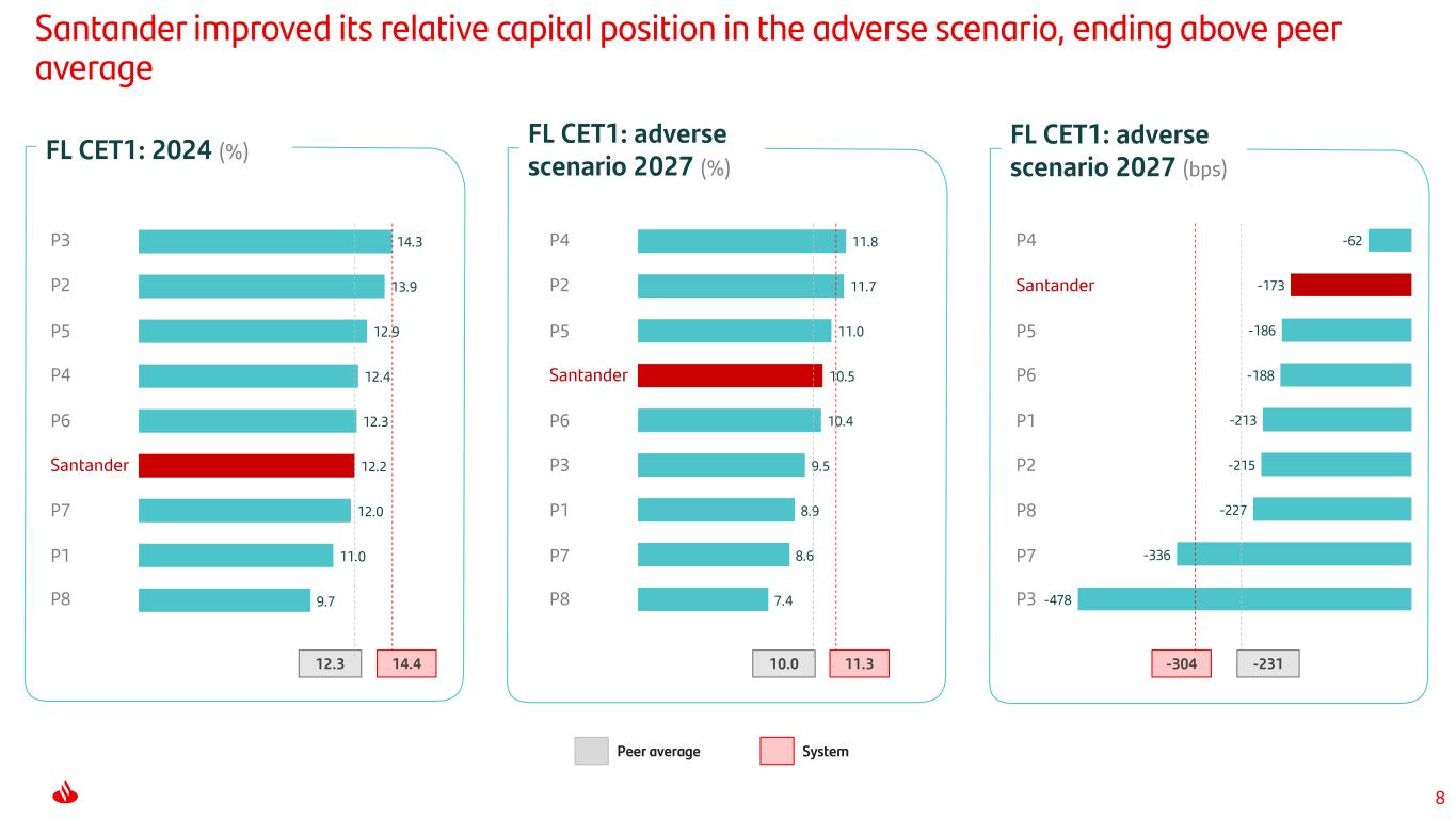 7 In the EBA Stress Test, Santander had the highest PAT in the baseline scenario and the second highest under the adverse scenario (1) Accumulated profit after tax (3 years) in €mn. FX impact is only applied in the adverse scenario. PROFIT AFTER TAX - BASELINE SCENARIO (€mn) 1 PROFIT AFTER TAX - ADVERSE SCENARIO (€mn) 1 Santander Peer average System 805-2787,848 11,810 10,769 9,439 3,221 692 -98 -6,666 -7,605 -14,320 P2 Santander P4 P1 P6 P5 P7 P8 P3 54,173 39,461 28,692 26,145 26,069 23,086 18,677 16,857 13,562 P1 P2 P3 P4 P5 P6 P7 P8 27,414