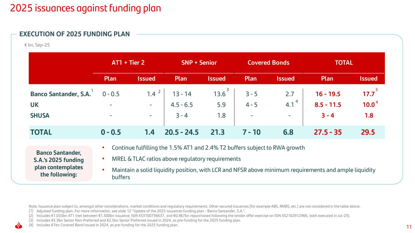 11 2025 issuances against funding plan Plan Issued Plan Issued Plan Issued Plan Issued Banco Santander, S.A. 0 - 0.5 1.4 13 - 14 13.6 3 - 5 2.7 16 - 19.5 17.7 UK - - 4.5 - 6.5 5.9 4 - 5 4.1 8.5 - 11.5 10.0 SHUSA - - 3 - 4 1.8 - - 3 - 4 1.8 TOTAL 0 - 0.5 1.4 20.5 - 24.5 21.3 7 - 10 6.8 27.5 - 35 29.5 AT1 + Tier 2 SNP + Senior Covered Bonds TOTAL € bn, Sep-25 3 • Continue fulfilling the 1.5% AT1 and 2.4% T2 buffers subject to RWA growth • MREL & TLAC ratios above regulatory requirements • Maintain a solid liquidity position, with LCR and NFSR above minimum requirements and ample liquidity buffers 4 3 EXECUTION OF 2025 FUNDING PLAN Banco Santander, S.A.’s 2025 funding plan contemplates the following: 4 Note: Issuance plan subject to, amongst other considerations, market conditions and regulatory requirements. Other secured issuances (for example ABS, RMBS, etc.) are not considered in the table above. (1) Adjusted funding plan. For more information, see slide 12 ”Update of the 2025 issuances funding plan - Banco Santander, S.A.”. (2) Includes €1.033bn AT1 (net between €1.500bn issuance, ISIN XS3100756637, and €0.467bn repurchased following the tender offer exercise on ISIN XS2102912966, both executed in Jul-25). (3) Includes €5.3bn Senior Non-Preferred and €2.5bn Senior Preferred issued in 2024, as pre-funding for the 2025 funding plan. (4) Includes €1bn Covered Bond issued in 2024, as pre-funding for the 2025 funding plan. 21