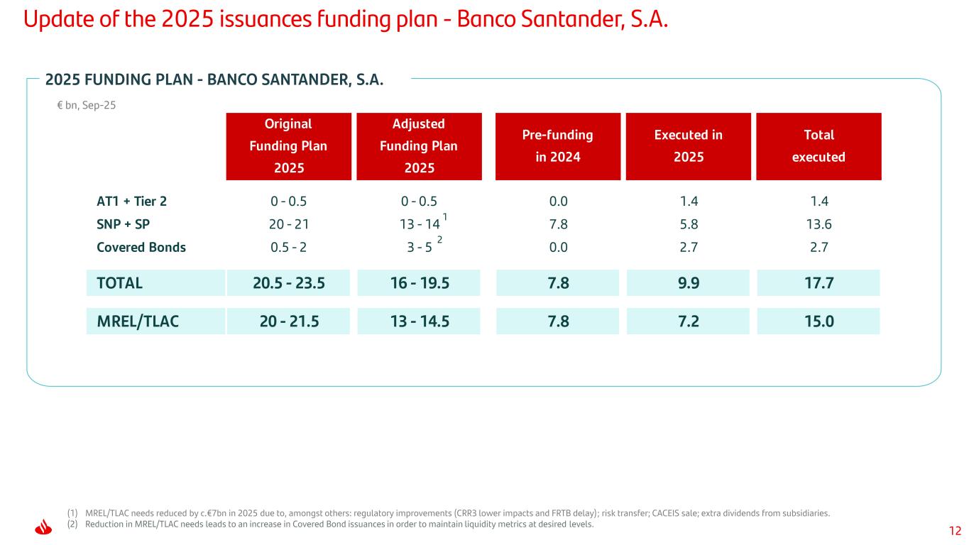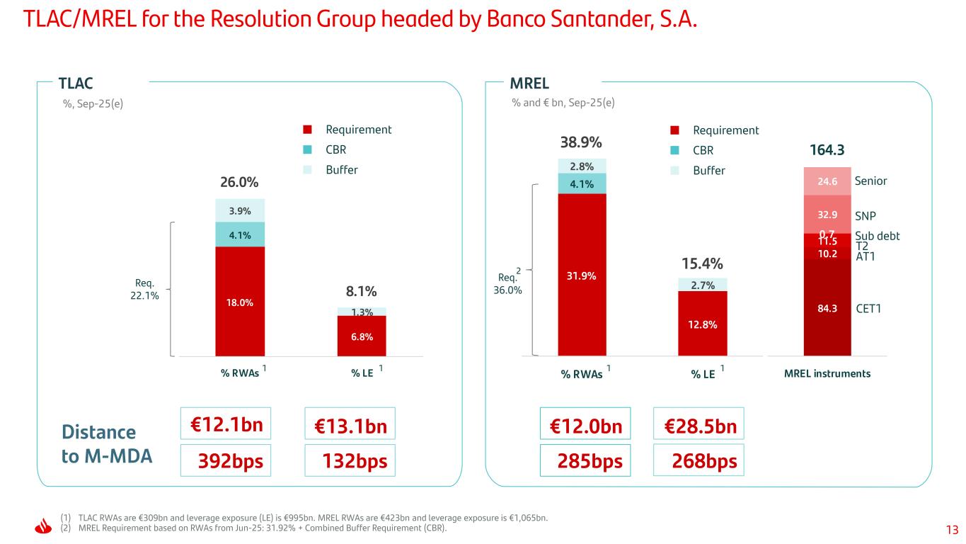 12 Update of the 2025 issuances funding plan - Banco Santander, S.A. Original Funding Plan Adjusted Funding Plan 2025 2025 AT1 + Tier 2 0 - 0.5 0 - 0.5 0.0 1.4 1.4 SNP + SP 20 - 21 13 - 14 7.8 5.8 13.6 Covered Bonds 0.5 - 2 3 - 5 0.0 2.7 2.7 TOTAL 20.5 - 23.5 16 - 19.5 7.8 9.9 17.7 MREL/TLAC 20 - 21.5 13 - 14.5 7.8 7.2 15.0 Executed in 2025 Total executed Pre-funding in 2024 1 2025 FUNDING PLAN - BANCO SANTANDER, S.A. (1) MREL/TLAC needs reduced by c.€7bn in 2025 due to, amongst others: regulatory improvements (CRR3 lower impacts and FRTB delay); risk transfer; CACEIS sale; extra dividends from subsidiaries. (2) Reduction in MREL/TLAC needs leads to an increase in Covered Bond issuances in order to maintain liquidity metrics at desired levels. 2 € bn, Sep-25