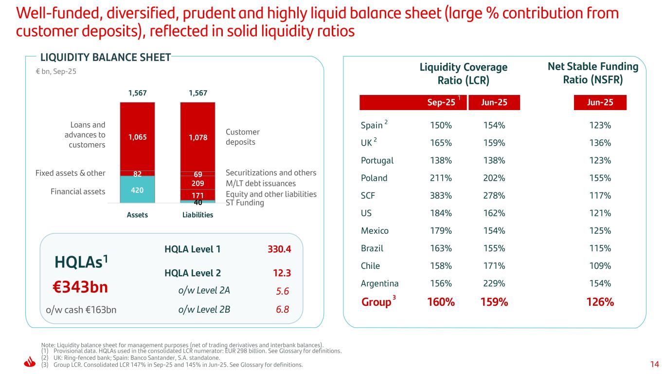 14 Well-funded, diversified, prudent and highly liquid balance sheet (large % contribution from customer deposits), reflected in solid liquidity ratios € bn, Sep-25 Net Stable Funding Ratio (NSFR) Sep-25 Jun-25 Jun-25 Spain 2 150% 154% 123% UK 2 165% 159% 136% Portugal 138% 138% 123% Poland 211% 202% 155% SCF 383% 278% 117% US 184% 162% 121% Mexico 179% 154% 125% Brazil 163% 155% 115% Chile 158% 171% 109% Argentina 156% 229% 154% Group 160% 159% 126% 1 Liquidity Coverage Ratio (LCR) ST Funding Securitizations and others Loans and advances to customers Fixed assets & other Customer deposits M/LT debt issuances Equity and other liabilitiesFinancial assets 420 40 82 171 1,065 209 69 1,078 1,567 1,567 Assets Liabilities HQLAs1 3 LIQUIDITY BALANCE SHEET €343bn o/w cash €163bn HQLA Level 1 330.4 HQLA Level 2 12.3 o/w Level 2A 5.6 o/w Level 2B 6.8 Note: Liquidity balance sheet for management purposes (net of trading derivatives and interbank balances). (1) Provisional data. HQLAs used in the consolidated LCR numerator: EUR 298 billion. See Glossary for definitions. (2) UK: Ring-fenced bank; Spain: Banco Santander, S.A. standalone. (3) Group LCR. Consolidated LCR 147% in Sep-25 and 145% in Jun-25. See Glossary for definitions.