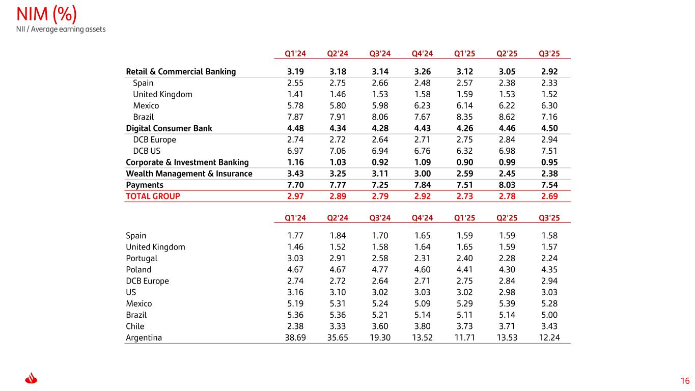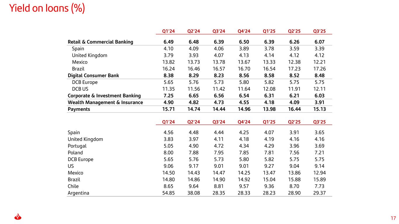 16 NIM (%) NII / Average earning assets Q1'24 Q2'24 Q3'24 Q4'24 Q1'25 Q2'25 Q3'25 Retail & Commercial Banking 3.19 3.18 3.14 3.26 3.12 3.05 2.92 Spain 2.55 2.75 2.66 2.48 2.57 2.38 2.33 United Kingdom 1.41 1.46 1.53 1.58 1.59 1.53 1.52 Mexico 5.78 5.80 5.98 6.23 6.14 6.22 6.30 Brazil 7.87 7.91 8.06 7.67 8.35 8.62 7.16 Digital Consumer Bank 4.48 4.34 4.28 4.43 4.26 4.46 4.50 DCB Europe 2.74 2.72 2.64 2.71 2.75 2.84 2.94 DCB US 6.97 7.06 6.94 6.76 6.32 6.98 7.51 Corporate & Investment Banking 1.16 1.03 0.92 1.09 0.90 0.99 0.95 Wealth Management & Insurance 3.43 3.25 3.11 3.00 2.59 2.45 2.38 Payments 7.70 7.77 7.25 7.84 7.51 8.03 7.54 TOTAL GROUP 2.97 2.89 2.79 2.92 2.73 2.78 2.69 Q1'24 Q2'24 Q3'24 Q4'24 Q1'25 Q2'25 Q3'25 Spain 1.77 1.84 1.70 1.65 1.59 1.59 1.58 United Kingdom 1.46 1.52 1.58 1.64 1.65 1.59 1.57 Portugal 3.03 2.91 2.58 2.31 2.40 2.28 2.24 Poland 4.67 4.67 4.77 4.60 4.41 4.30 4.35 DCB Europe 2.74 2.72 2.64 2.71 2.75 2.84 2.94 US 3.16 3.10 3.02 3.03 3.02 2.98 3.03 Mexico 5.19 5.31 5.24 5.09 5.29 5.39 5.28 Brazil 5.36 5.36 5.21 5.14 5.11 5.14 5.00 Chile 2.38 3.33 3.60 3.80 3.73 3.71 3.43 Argentina 38.69 35.65 19.30 13.52 11.71 13.53 12.24