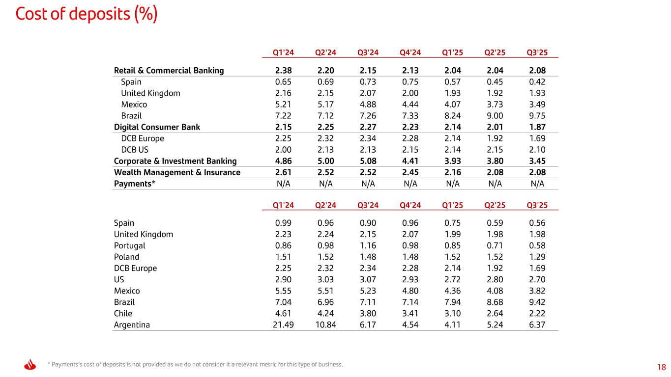 17 Yield on loans (%) Q1'24 Q2'24 Q3'24 Q4'24 Q1'25 Q2'25 Q3'25 Retail & Commercial Banking 6.49 6.48 6.39 6.50 6.39 6.26 6.07 Spain 4.10 4.09 4.06 3.89 3.78 3.59 3.39 United Kingdom 3.79 3.93 4.07 4.13 4.14 4.12 4.12 Mexico 13.82 13.73 13.78 13.67 13.33 12.38 12.21 Brazil 16.24 16.46 16.57 16.70 16.54 17.23 17.26 Digital Consumer Bank 8.38 8.29 8.23 8.56 8.58 8.52 8.48 DCB Europe 5.65 5.76 5.73 5.80 5.82 5.75 5.75 DCB US 11.35 11.56 11.42 11.64 12.08 11.91 12.11 Corporate & Investment Banking 7.25 6.65 6.56 6.54 6.31 6.21 6.03 Wealth Management & Insurance 4.90 4.82 4.73 4.55 4.18 4.09 3.91 Payments 15.71 14.74 14.44 14.96 13.98 16.44 15.13 Q1'24 Q2'24 Q3'24 Q4'24 Q1'25 Q2'25 Q3'25 Spain 4.56 4.48 4.44 4.25 4.07 3.91 3.65 United Kingdom 3.83 3.97 4.11 4.18 4.19 4.16 4.16 Portugal 5.05 4.90 4.72 4.34 4.29 3.96 3.69 Poland 8.00 7.88 7.95 7.85 7.81 7.56 7.21 DCB Europe 5.65 5.76 5.73 5.80 5.82 5.75 5.75 US 9.06 9.17 9.01 9.01 9.27 9.04 9.14 Mexico 14.50 14.43 14.47 14.25 13.47 13.86 12.94 Brazil 14.80 14.86 14.90 14.92 15.04 15.88 15.89 Chile 8.65 9.64 8.81 9.57 9.36 8.70 7.73 Argentina 54.85 38.08 28.35 28.33 28.23 28.90 29.37